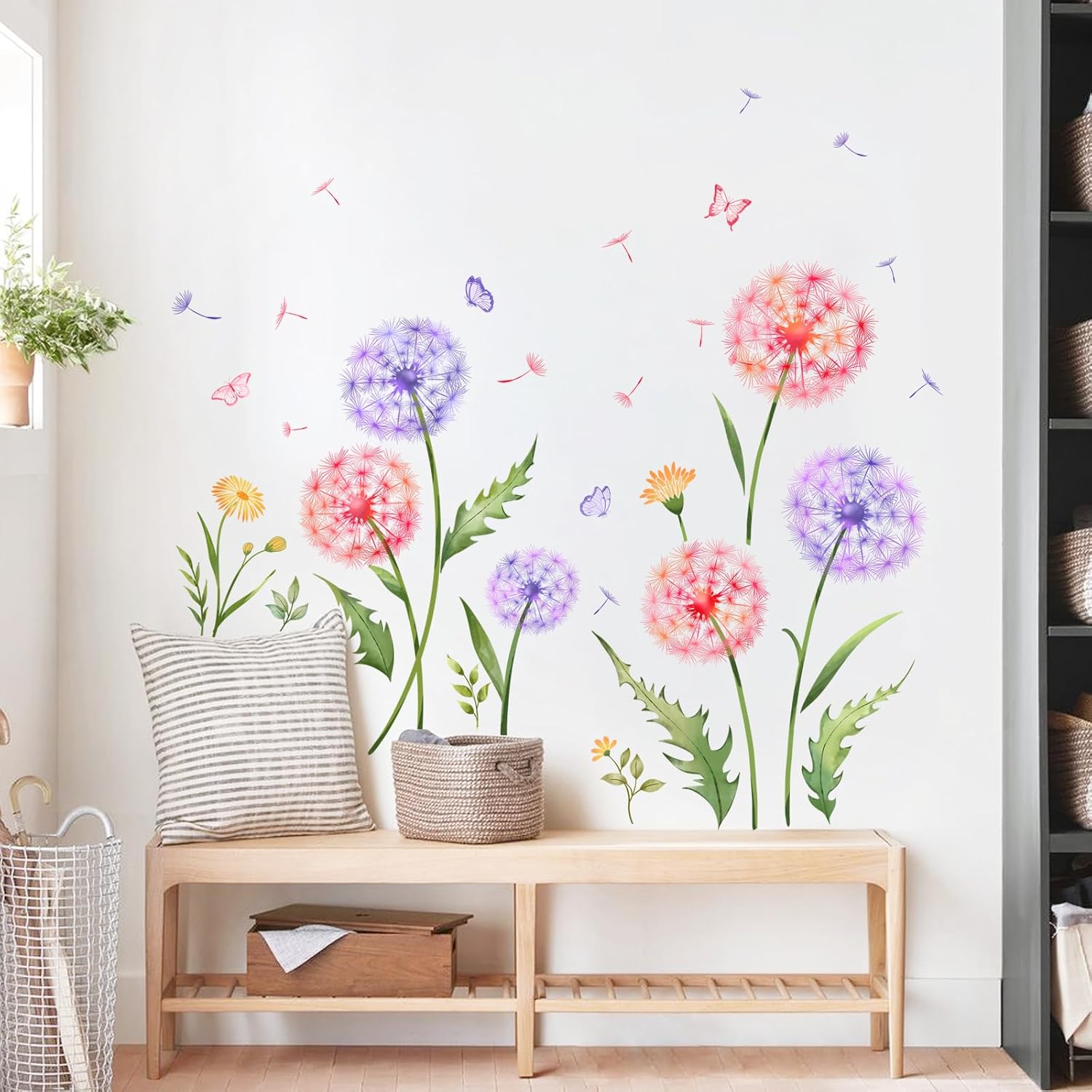 - ăSpecial Designă: Featuring with pink and purple dadenlion flowers and flying butterflies pattern, this floral wall art decal will give a new look to your space and make your house or office pretty and fashionable. Add a decorative element without blocking the view.