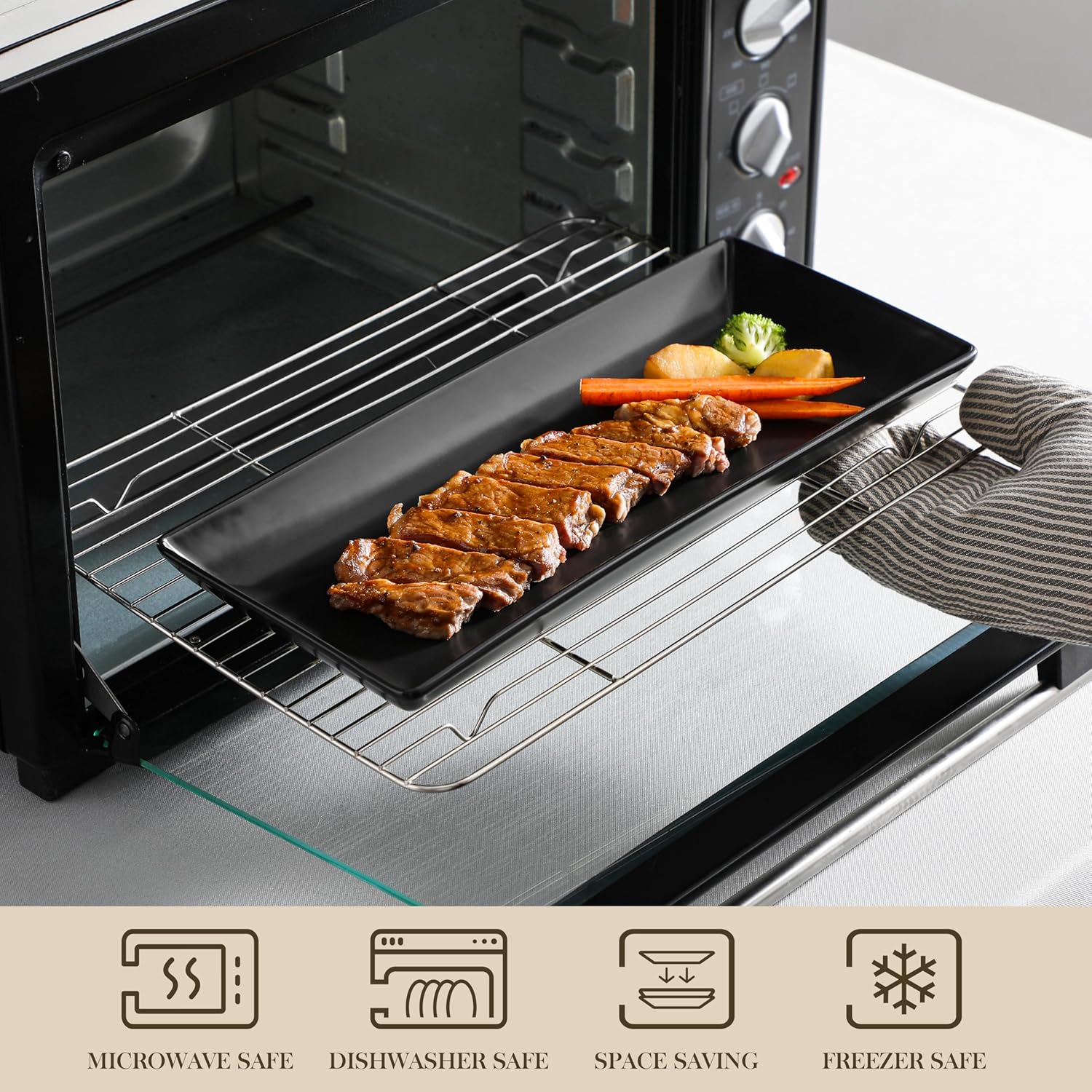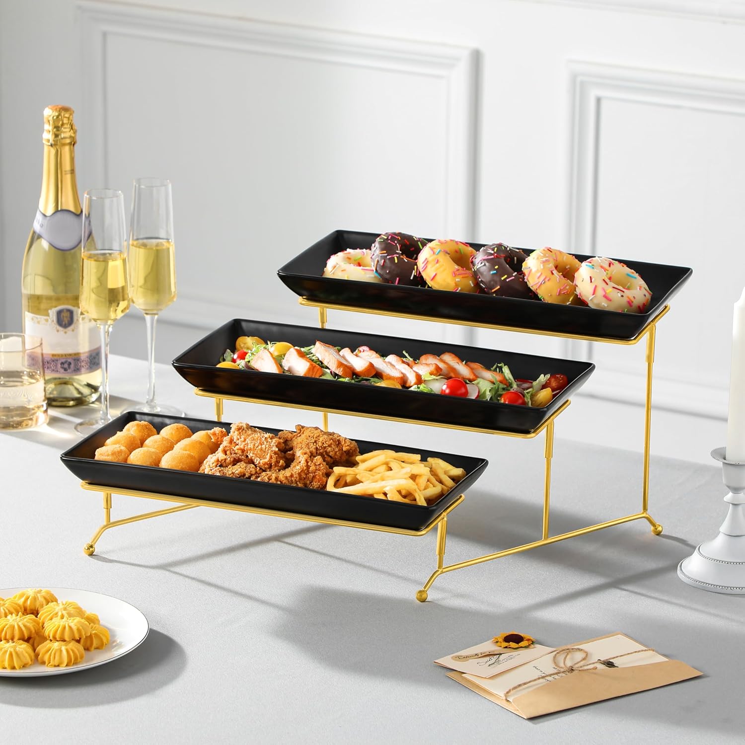 - Sturdy and Stable: Our 14-inch serving tray stand comes with 3 layer sturdy metal stand with three of white rectangular ceramics trays, providing ample space to elegantly present your food and desserts, The black metal rack is robust, and stable,foldable, allowing to flexibly adjust angles and convenient access to food. Our tiered platter stands firm while holding your favorite delicacies. Whether it’s delicate pastries or savory bites, rest assured the serving stand will make your display secure and eye-catching.