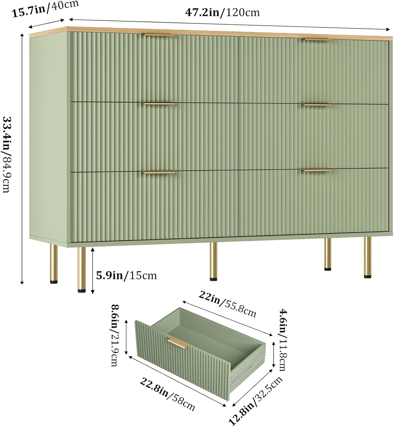 Fluted Wood Dresser 6 Drawers Dresser for Bedroom, Large Modern Chest of Drawers, for Bedroom, Living Room, Hallway, Entryway, Green and Oak