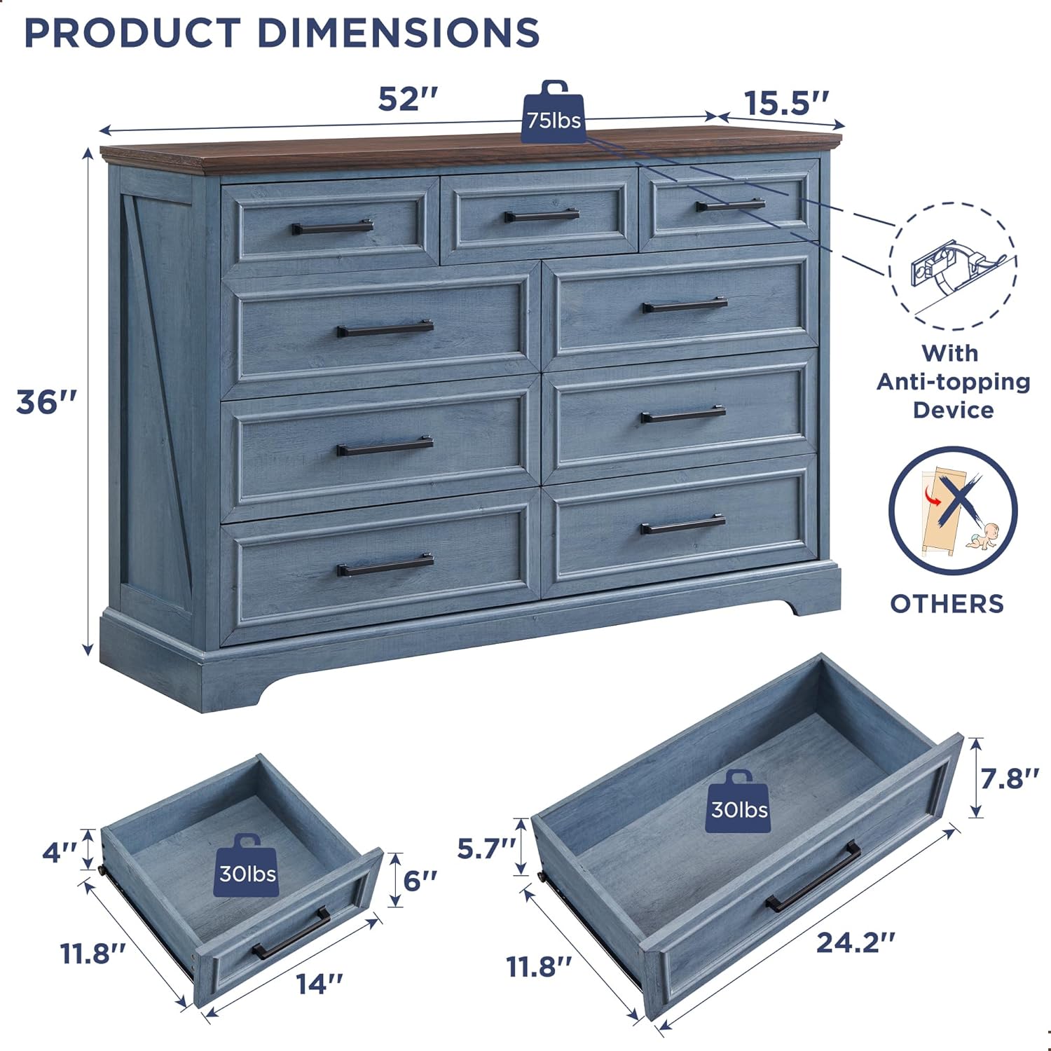 Farmhouse 9 Drawer Dresser for Bedroom, 36 Inch Tall Modern Dresser TV Stand with Large Drawers & Bar Handles, Rustic Wood Chest of Drawers for Bedroom, Living Room, Hallway, Blue