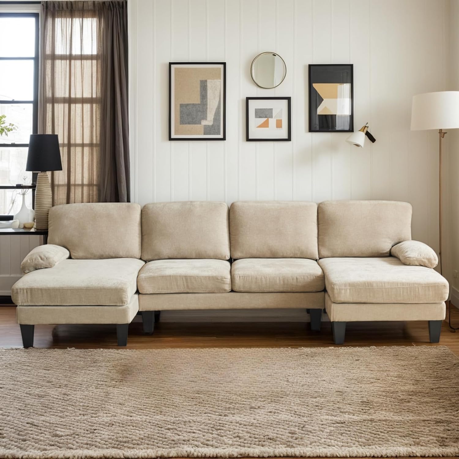 Karl home U-Shape Sectional Sofa Couch 111" Modern 4-Seat Sofa with Chaises Chenille Fabric Upholstered Covertible Couch with Wood Grain Legs for Living Room, Reception Room, Apartment, Khaki