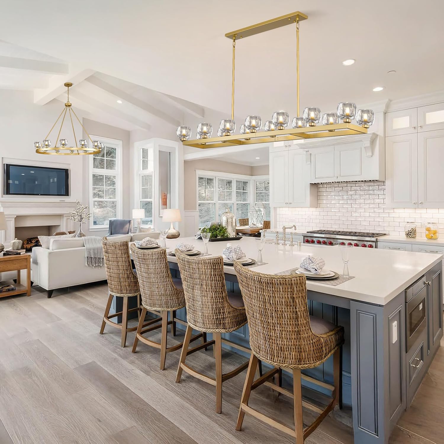 - 【Height Adjustable】Gold dining room chandelier over table measures 68 inches in length, 13.1 inches in width. It comes with 17.7-inch, 11.8-inch, and 5.9-inch rods, four of each size, max height is 77.1", weighs up to 62 pounds. Large modern chandeliers are heavy and need to be installed on a load-bearing ceiling. Perfect for modern minimalist aesthetics.