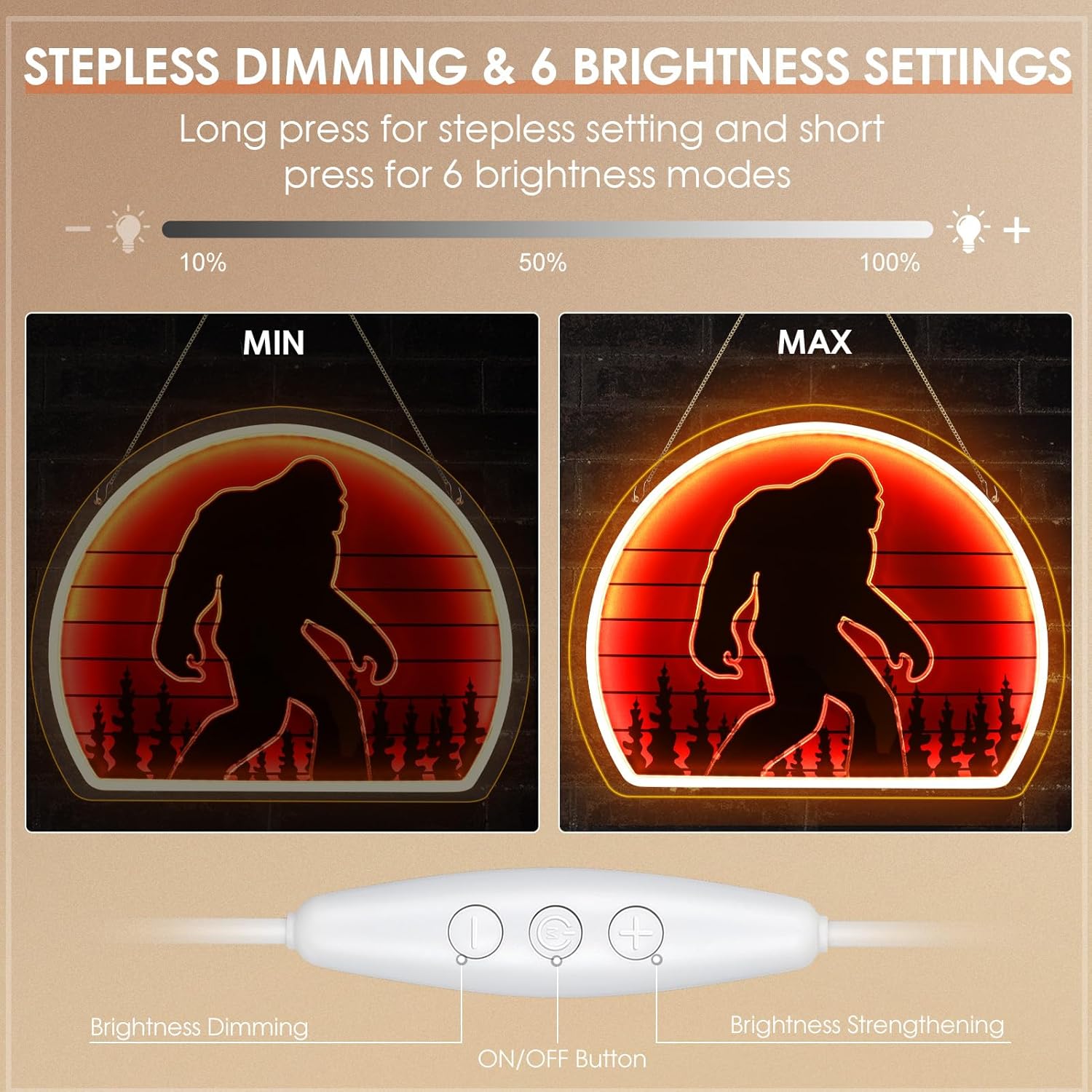 - 6 Levels of Brightness: The big foot neon signs for men adds a dimmer switch, offering 6 levels of brightness to set. Short press "+" and "-" buttons or long press for stepless brightening and dimming to meet various lighting needs. The warm white light color is bright and gives whole room a great ambiance, it also acts as a form of nightlight for kids.