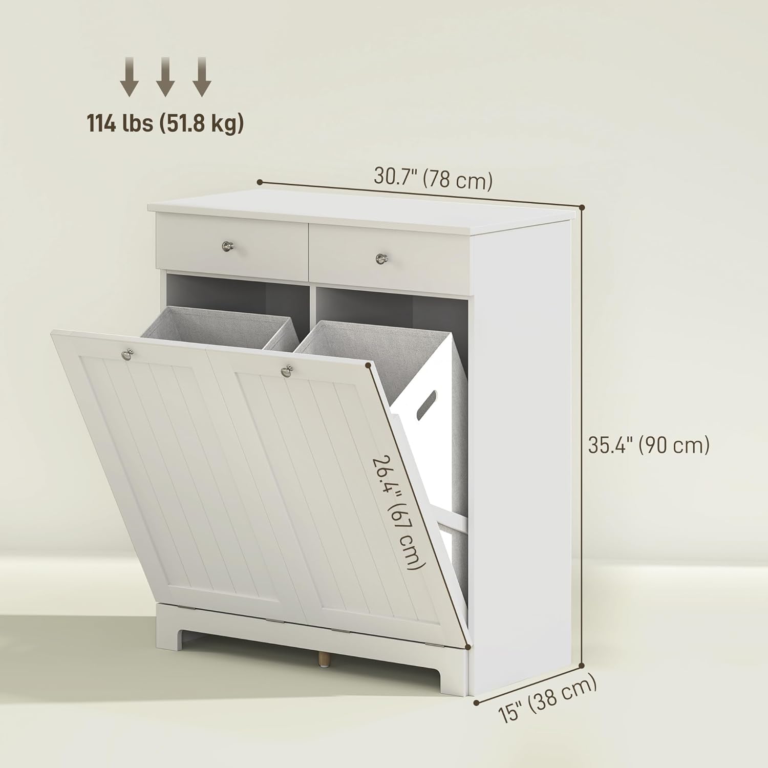HOMCOM Laundry Hamper Cabinet with 2 Removable Baskets, Tilt Out Laundry Hamper Cabinet with 2 Drawers and 2 Beadboard Doors, Laundry Cabinet Bathroom Storage Cabinet, White