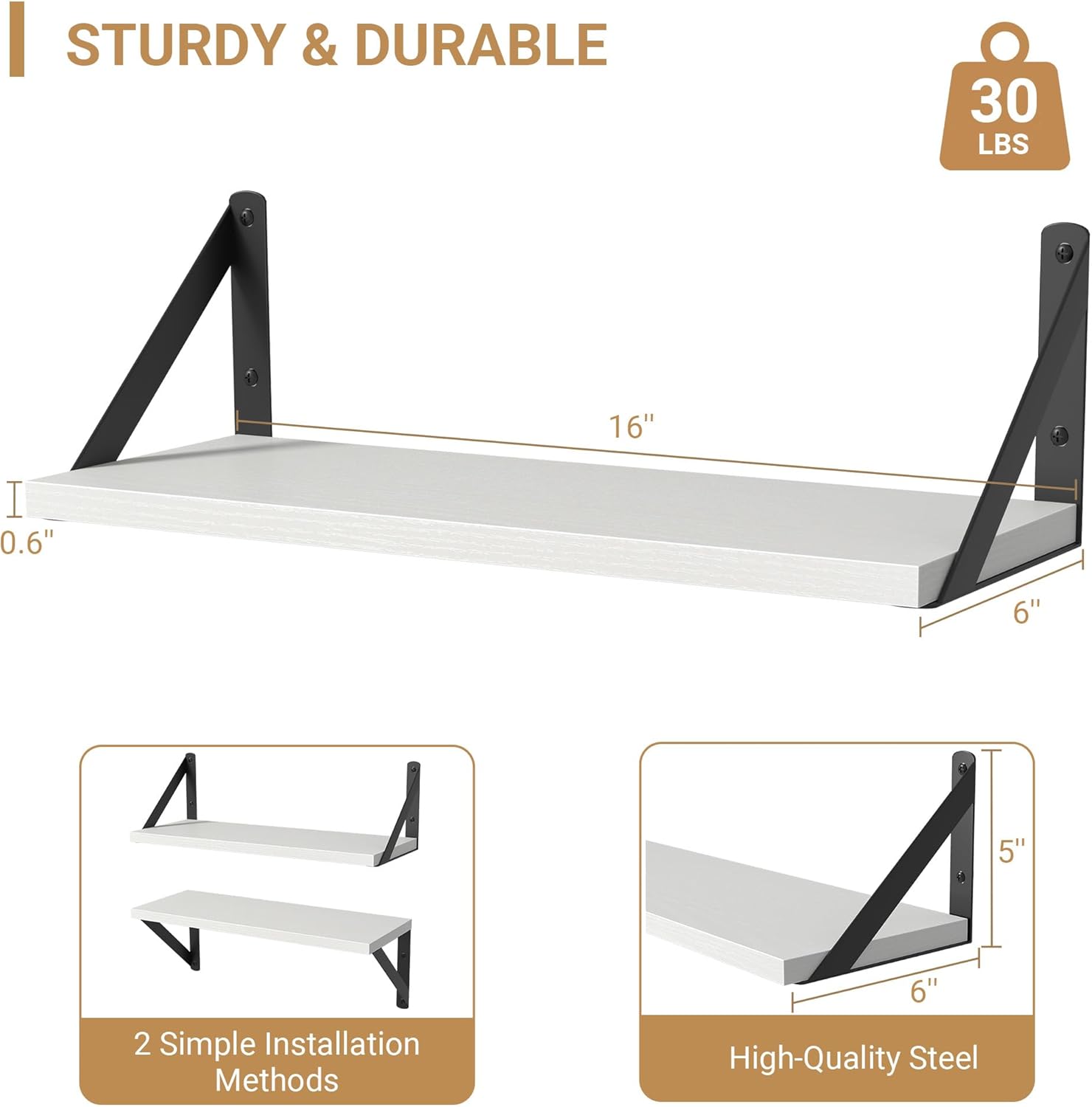 - ăSTURDY & DURABLEăEach wood floating shelves is made of 0.6-inch thick natural wood planks and powder coated steel brackets for durability. The triangular metal brackets are even stronger and can hold up to 40 pounds