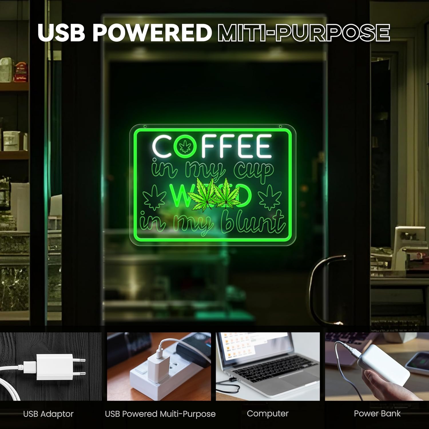 - 【Coffee Neon Sign】 "Coffee in my cup, Weed in my blunt". This neon sign is a unique storefront decoration sign. The unique slogan and design can make your shop stand out. Coffee, blunt, and weed all symbolize pleasure, which will definitely help you attract a large number of customers and leave a great impression on your guests.