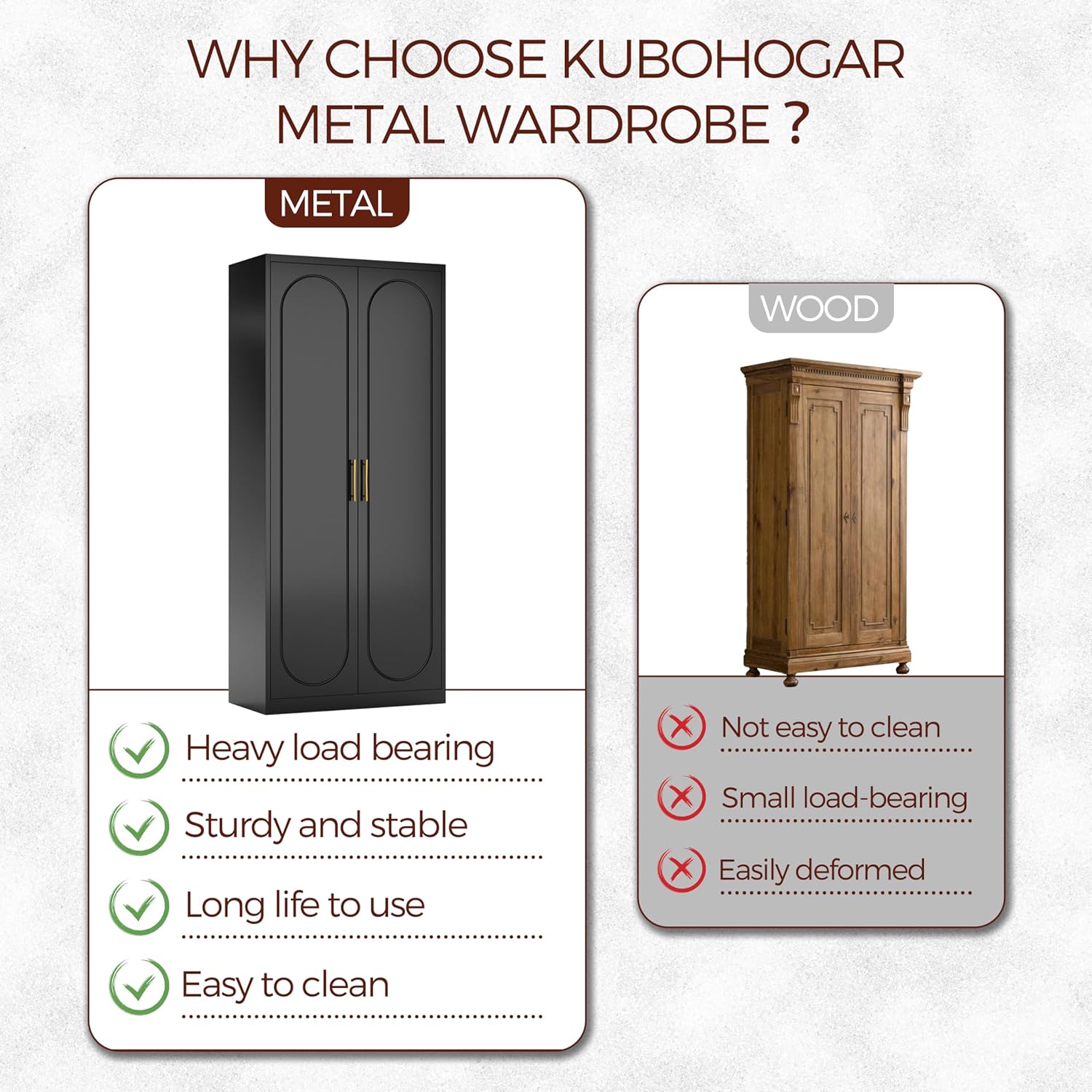 - High Quality Material: The black armoire wardrobe closet is made of thickened cold-rolled steel plate, which is strong and not easy to deform. The metal wardrobe cabinet is treated with environmentally friendly powder coating, which is resistant to moisture, corrosion and rust, and is more durable than wooden cabinets.