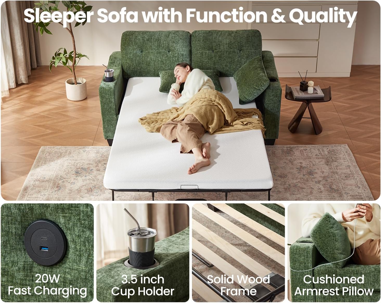CHIC HOUSE Pull Out Sofa Bed, Full Size Sleeper Sofa, 2-in-1 Convertible Chenille Couch with USB Charging, Memory Form Couch for Living Room, Apartment & Small Space (Green, Chenille - Full)