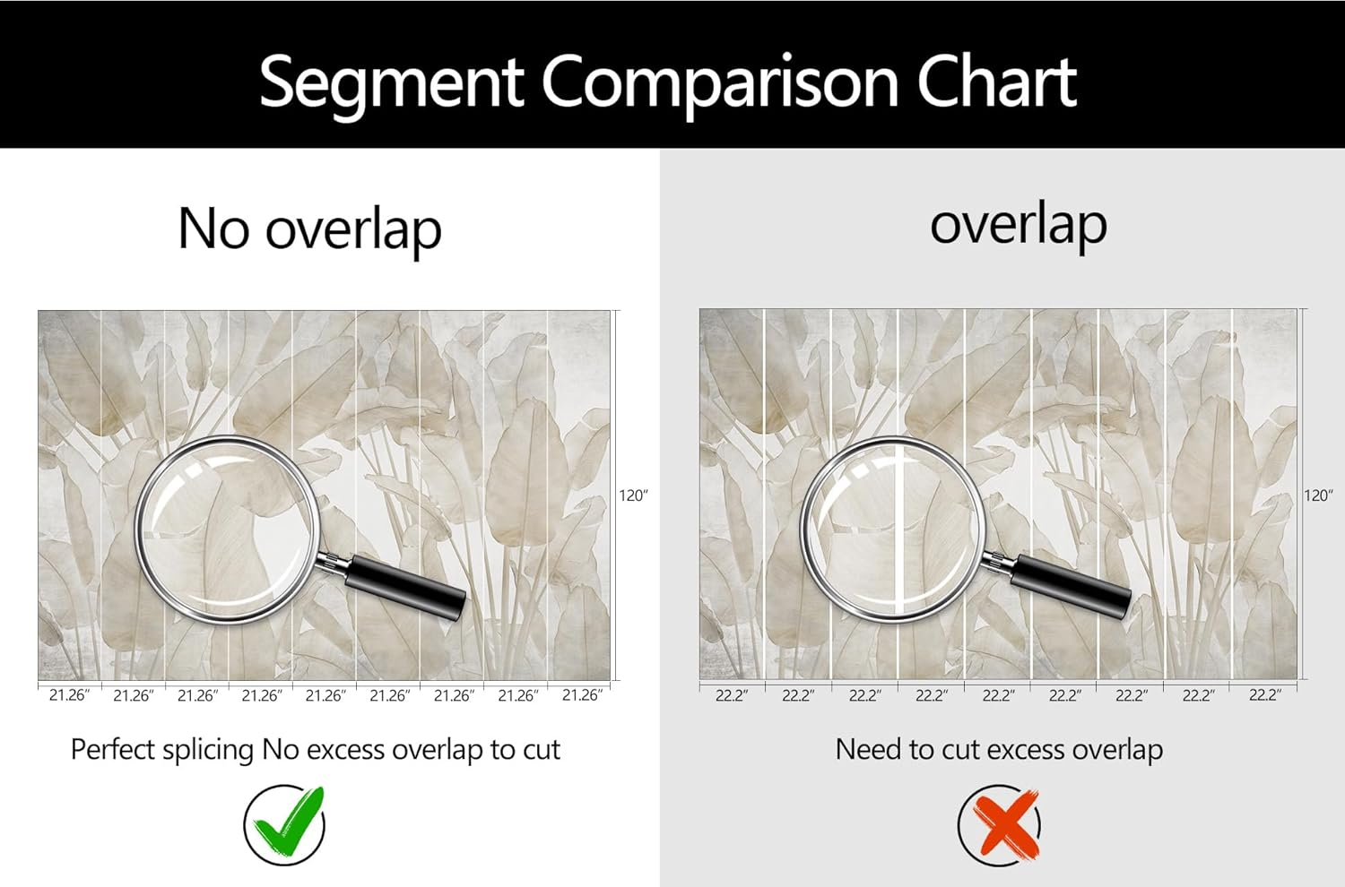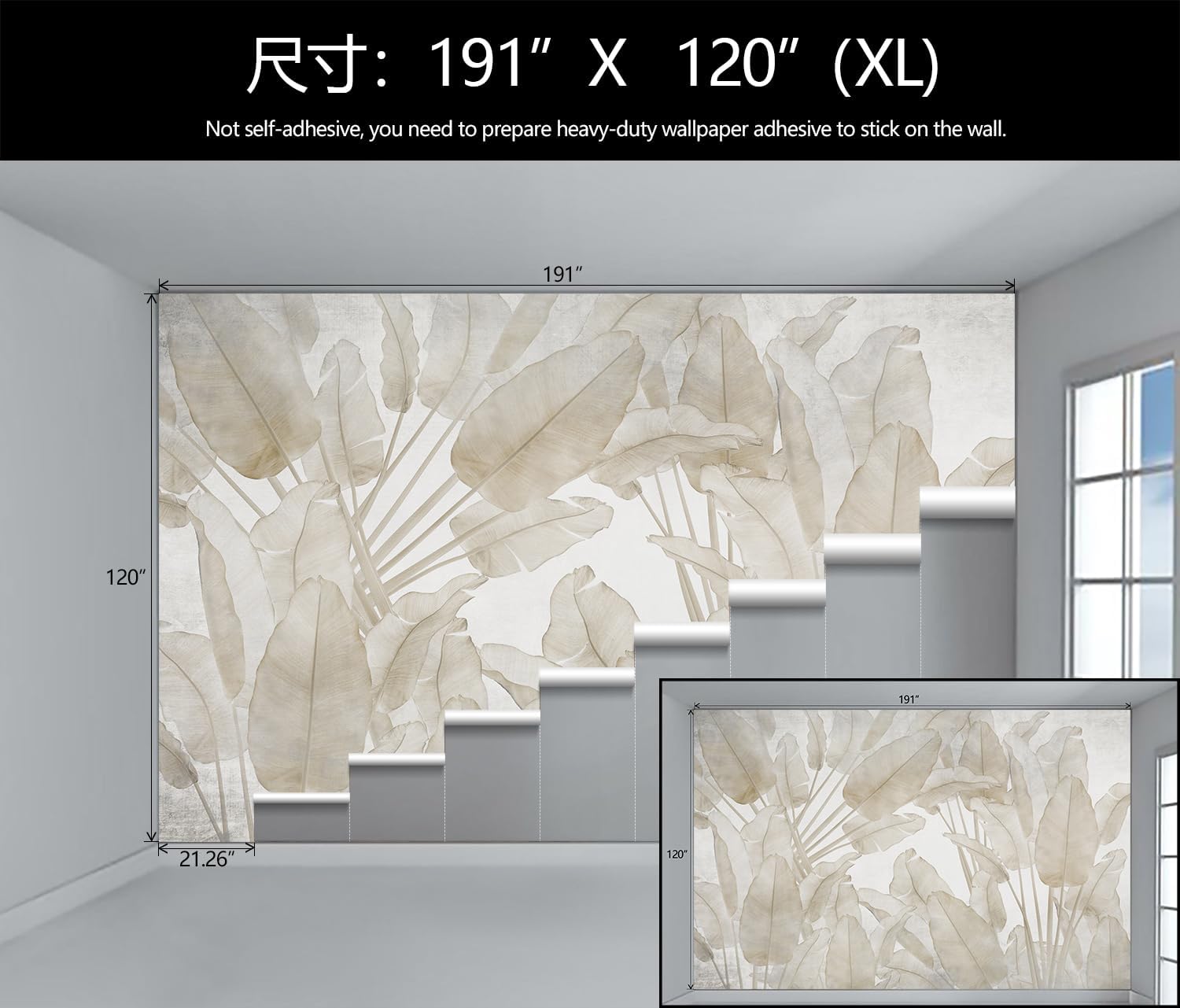 - Mural Size: The total size of this mural wallpaper is 191" x 120" / 486CM x 305CM (W x H), cut into 9 pieces, each measuring 21.26" x 120", for easy installation.