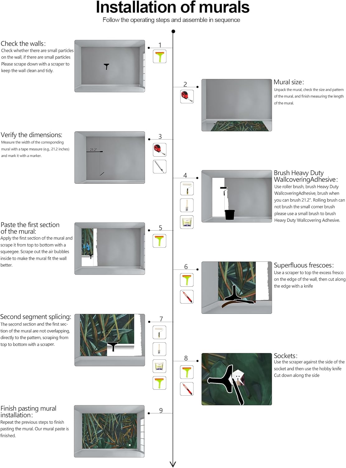 - Construction Installation: Each part of the mural is marked with a serial number underneath, no overlap, direct docking, in order. (Please refer to installation instructions)