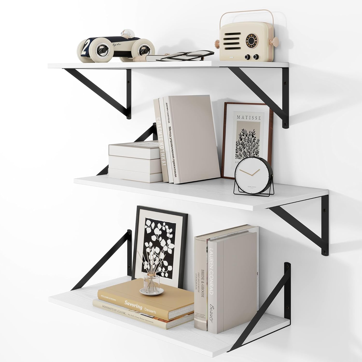 - Effortless 10-Minute Installation: All necessary hardware is included in the package. With pre-drilled mounting holes and detailed step-by-step instructions, these wide floating shelves can be securely installed in just minutes. Package Contents: 3 wooden boards (24" W x 12" D), 6 steel brackets, 13 anchors, 13 long screws, 13 short screws, 1 level, 1 installation manual.