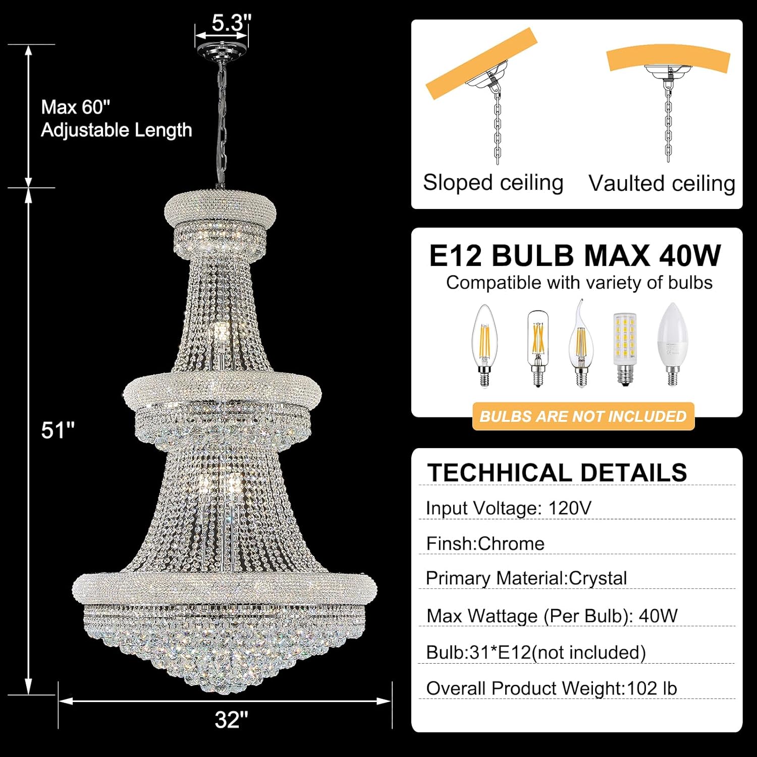 - Dimmable function: The Crystal Chandelier Lighting is compatible with any E12 bulbs. 31 Bulbs Required.(Bulbs not included)