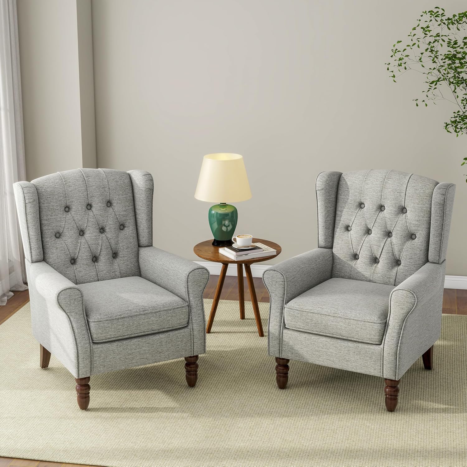 Accent Chair, Upholstered Armchair with Button Tufted High Back & Solid Wood Legs, Comfy Wingback Reading Single Sofa Chair for Small Spaces, Living Room, Bedroom (Light Grey, Set of 2)