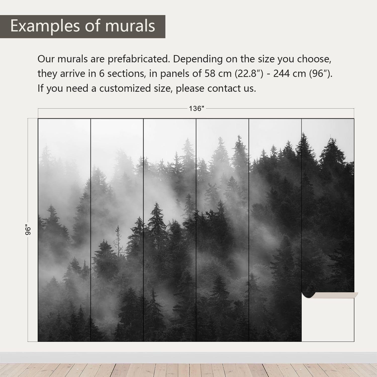- Size note: Mural measures 136"W x 96"H and is divided into 6 sections, each section is labeled with a number underneath, eliminating the need to overlap patterns when installing.