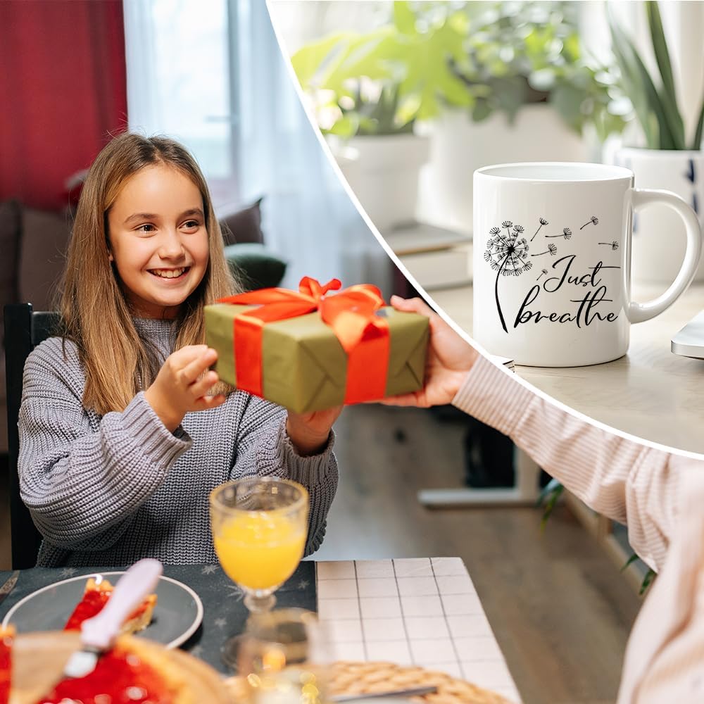 RZHV Just Breathe 11 Oz Novelty Mug, Funny Dandelion Coffee Mug for Floral Lover, Calming Gifts for Yoga Lover, Meditation Mental Health Gifts for Women