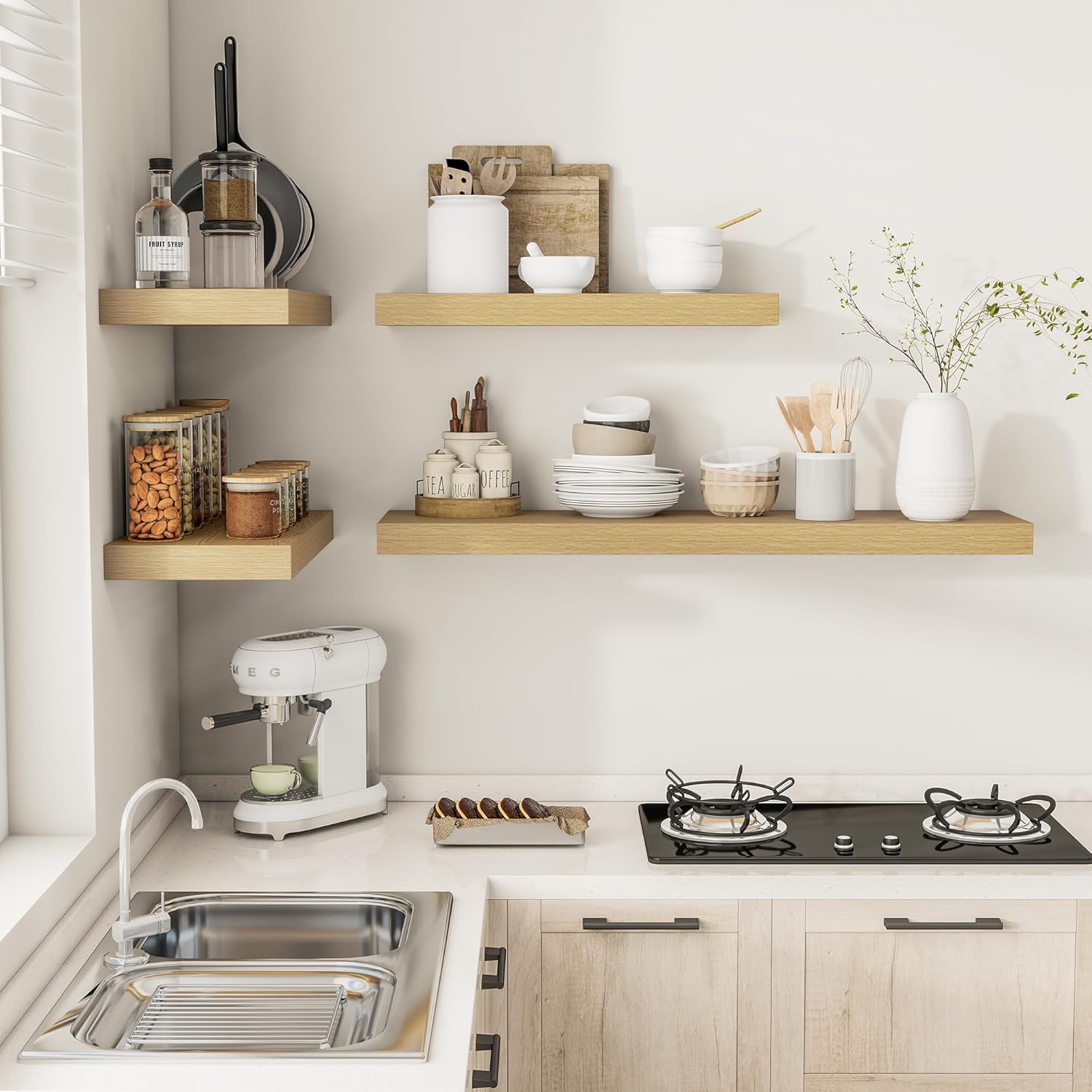 - Well-designed Floating Shelves - The rustic style floating shelves combining both practicality and style. These shelves offer a 12" generous deeper and thicker surface, perfect for organizing daily sundries without taking up valuable floor space.