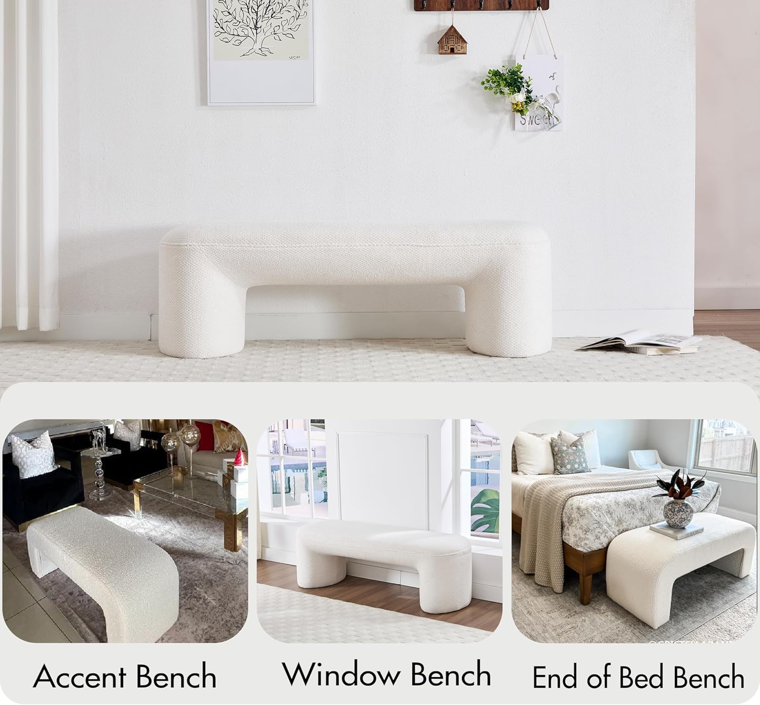 3-Piece 53" Comfy Upholstered Dining Bench with 2 Ottomans, Accent Waterfall Bench Modern End of Bed Entryway Bench Vanity Stool, White Chenille