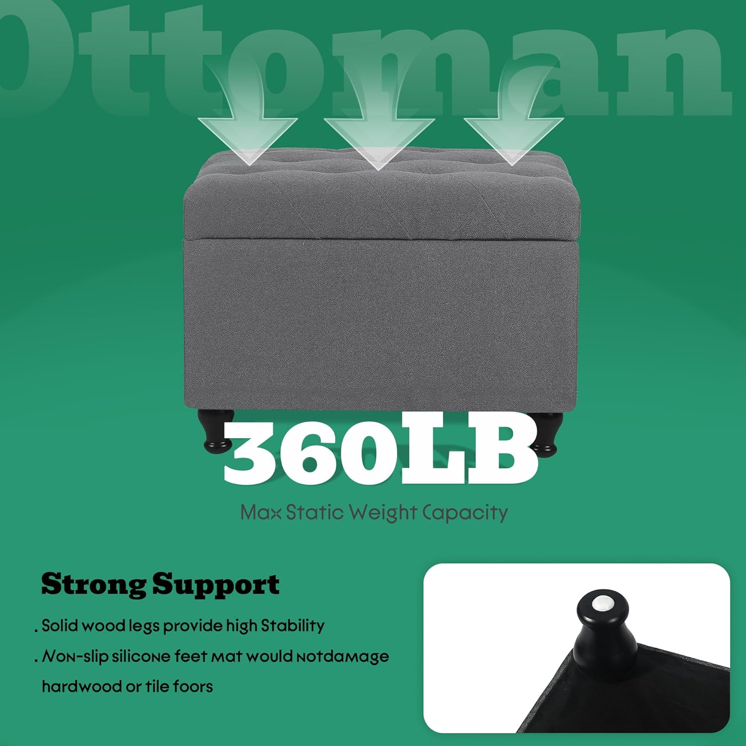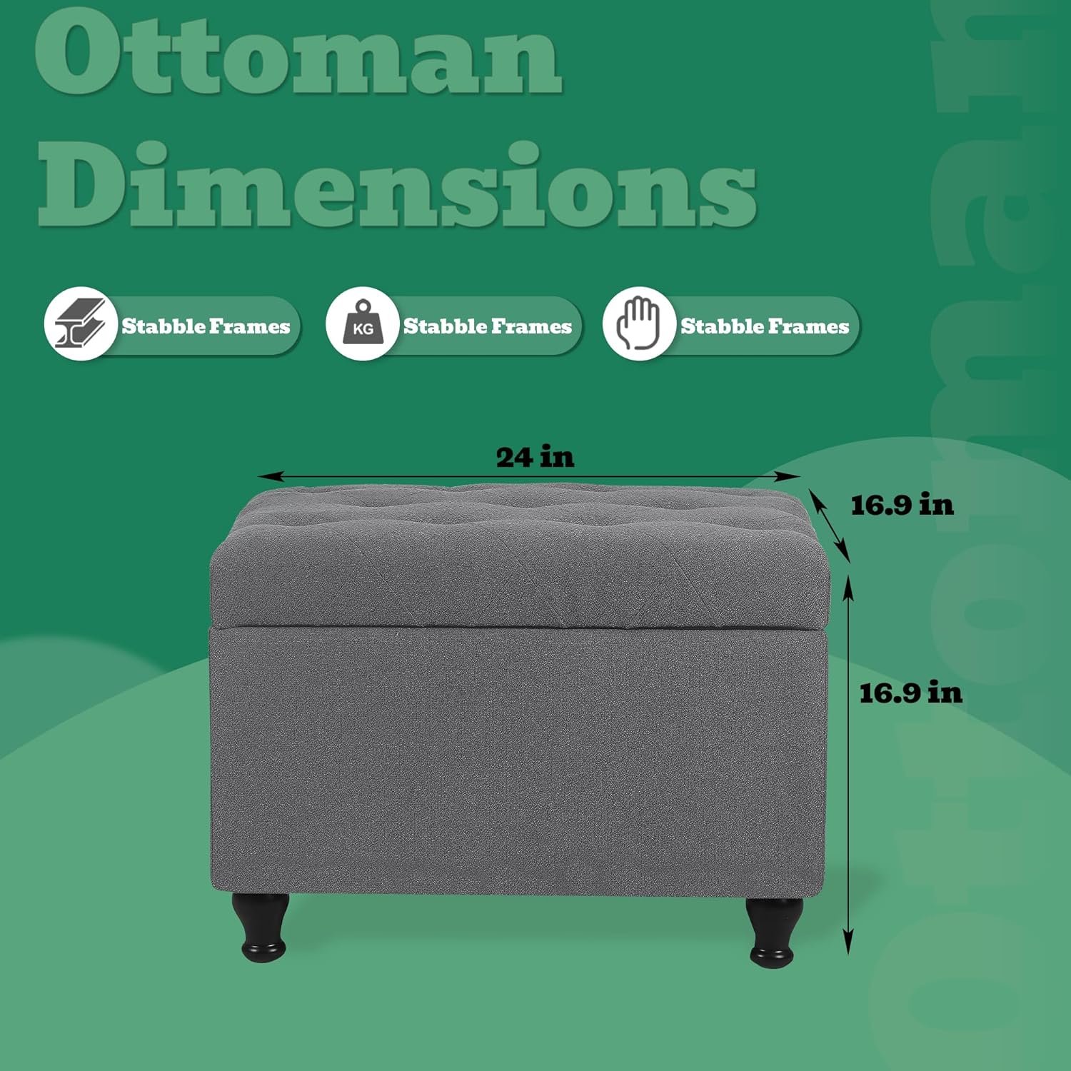 - ăProduct DimensionăâCrafted with meticulous attention to detail, this large storage ottoman bench spans 24.0 inches in length, 16.9 inches in width, and 16.9 inches in height, and a robust 360-pound weight capacity, If you have any questions about the product, please contact us and we will be honor to assist you.