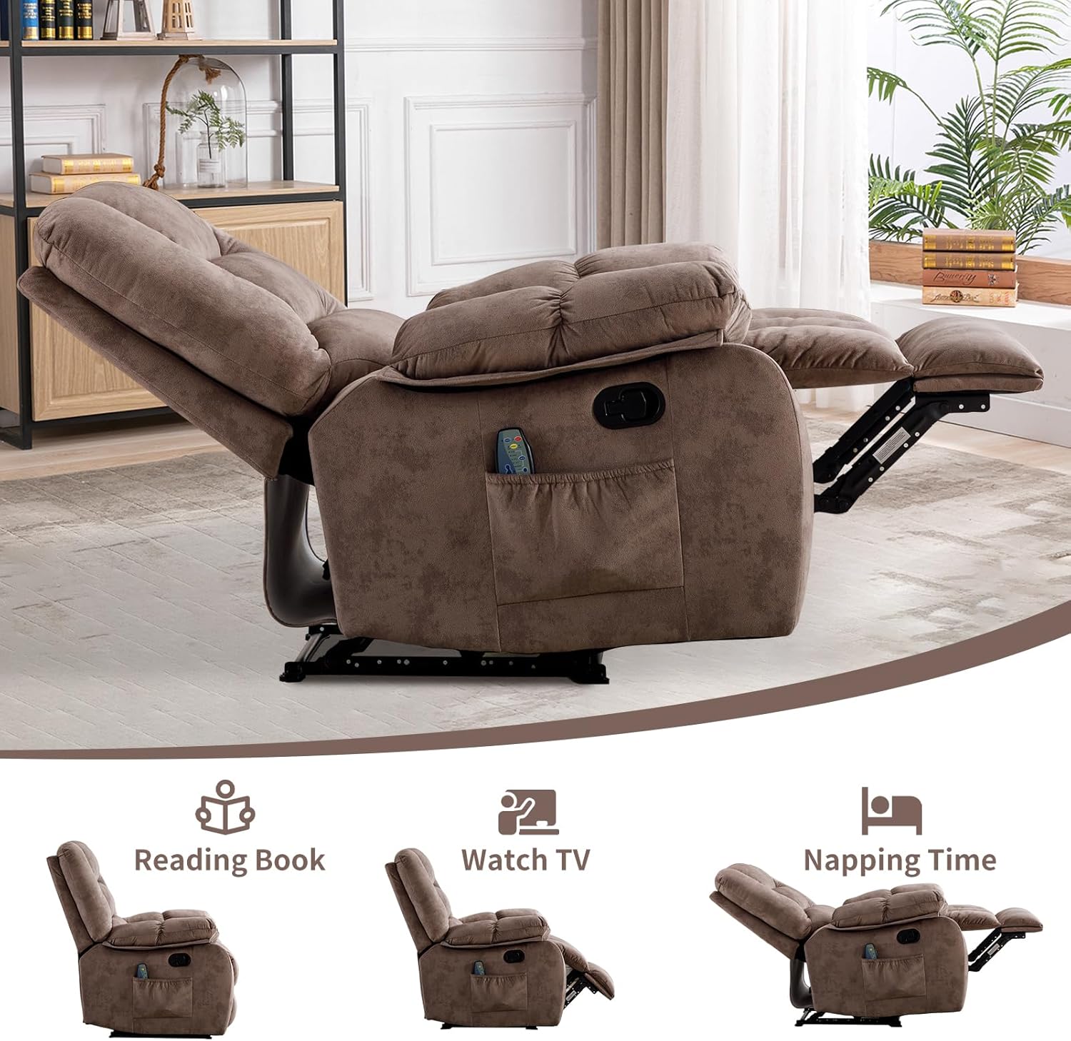 - completely. ăMassage & Lumbar HeatingăRelax in comfort with 8-point massage functionality and lumbar heating. This recliner targets key areas for your back, lumbar, thighs and legs to improve blood circulation, relieve tension, and reduce fatigue. Choose from 3 massage modes and adjustable intensity levels to customize your relaxation. The built-in timer lets you set 15, 30, or 60-minute massage sessions for convenience.