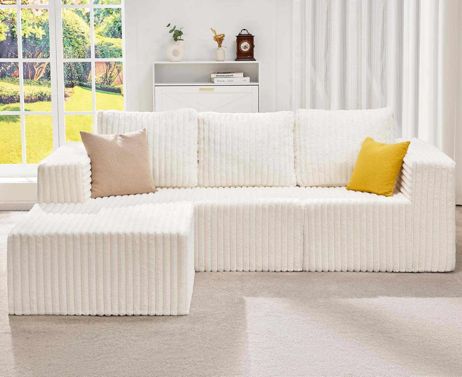 Hobestluk Modular Sectional Sofa Memory Foam Couch Oversized Sectional Sofa 3-Seater with Chaise Cloud Couch with Removable Cover L Shape Sofa for Living Room (Strip White, 3-Seater with Chaise)
