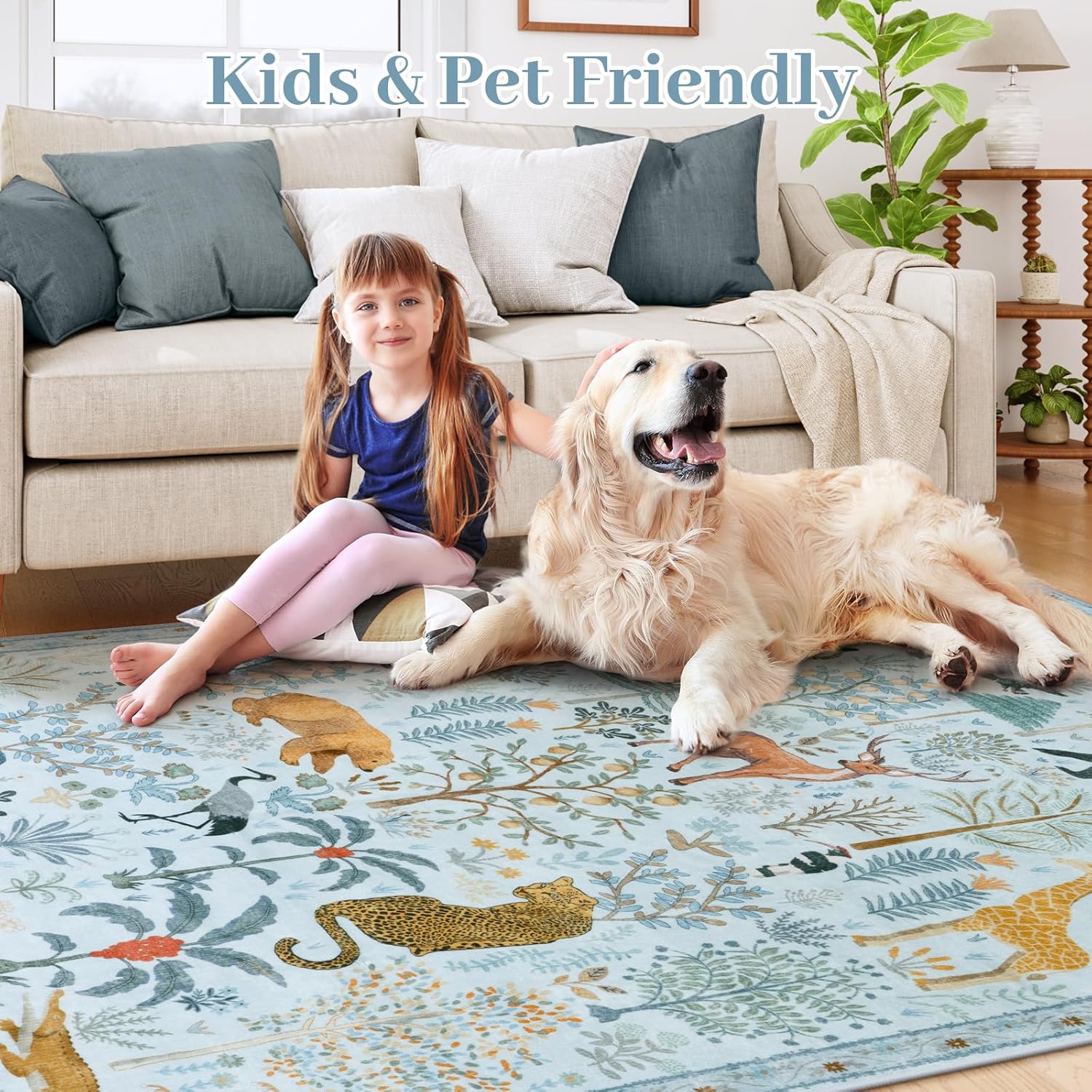 OJIA Animal Area Rugs 8x10, Soft 8x10 Washable Rugs for Living Room Bedroom, Non-Slip Boho Ultra-Thin Dining Room Rug Large Throw Carpet for Farmhouse Playroom Office, Light Blue