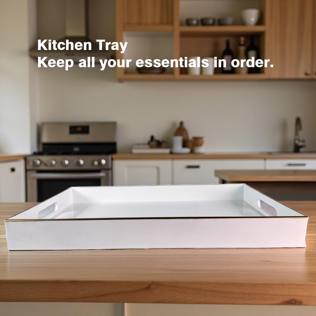 - Design: The size of the White tray is 15.7 x 11.8 inches, and it has two built-inhandles for easy carrying. lt has asimple, solid color finish with agolden top rim accent, and theedges are relatively smooth.