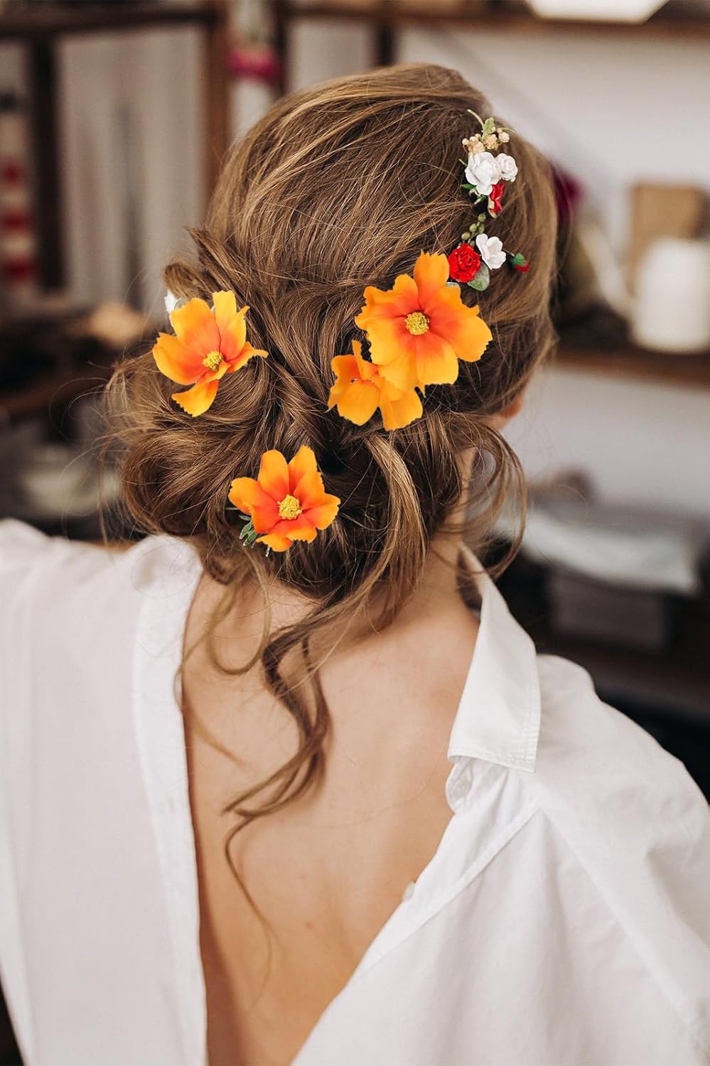 - Quantity and Size: Packed 5PCS orange cosmos artificial flowers. Total approx. 24.5inches/62cm height, bigger daisy flower 3.15β/8cm, smaller 2.36'' /6cm, cosmos bud 1.18β/3cm. Each daisy flowers artificial wildflowers set with 4 large flower heads, 1 small and 1 bud, total with 30 flowers heads. The long stem artificial flowers is ideal for your tall flowers for floor vase floral arrangements
