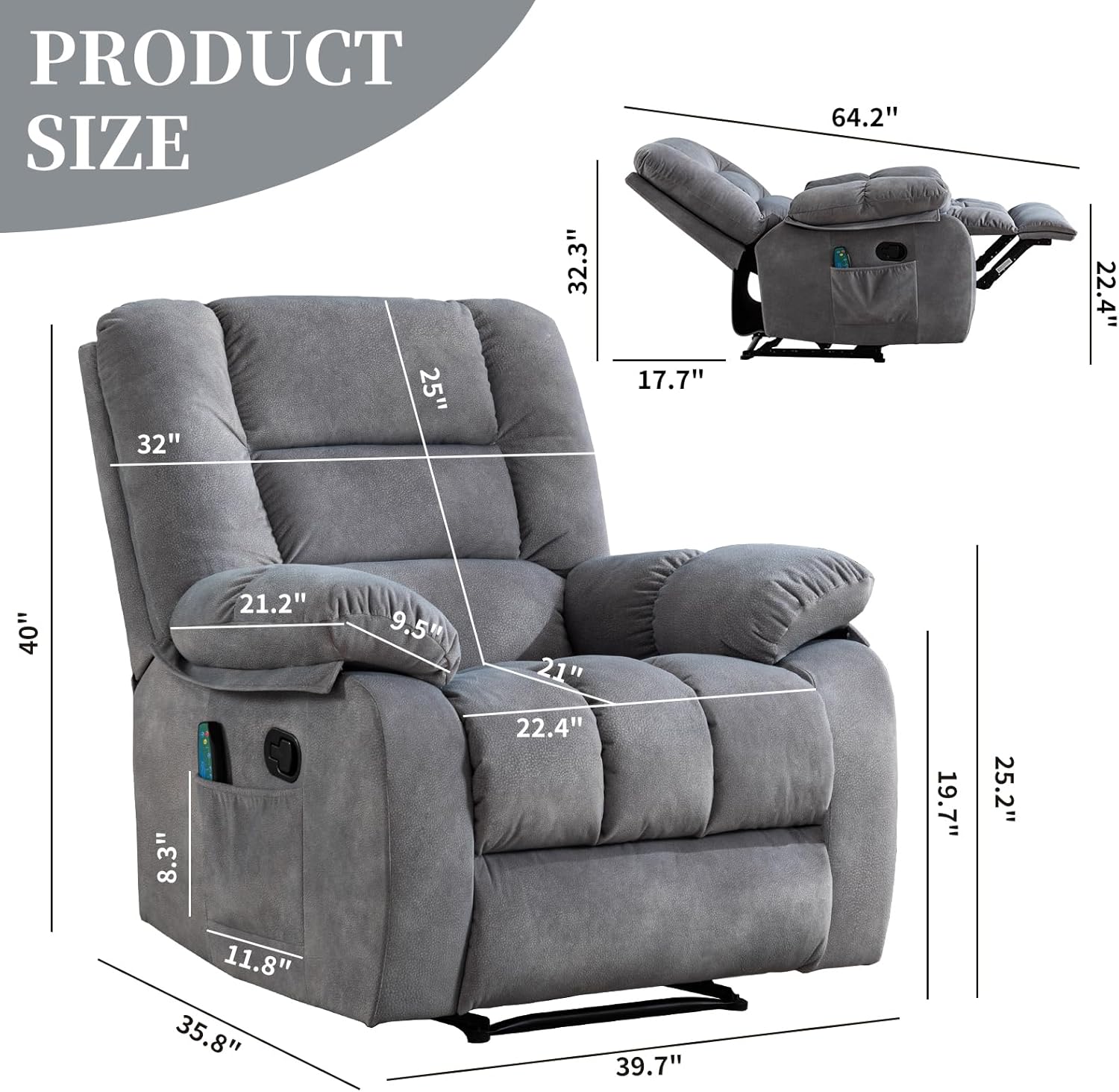 - ăMassage & Lumbar HeatingăRelax in comfort with 8-point massage functionality and lumbar heating. This recliner targets key areas for your back, lumbar, thighs and legs to improve blood circulation, relieve tension, and reduce fatigue. Choose from 3 massage modes and adjustable intensity levels to customize your relaxation. The built-in timer lets you set 15, 30, or 60-minute heating sessions for convenience.