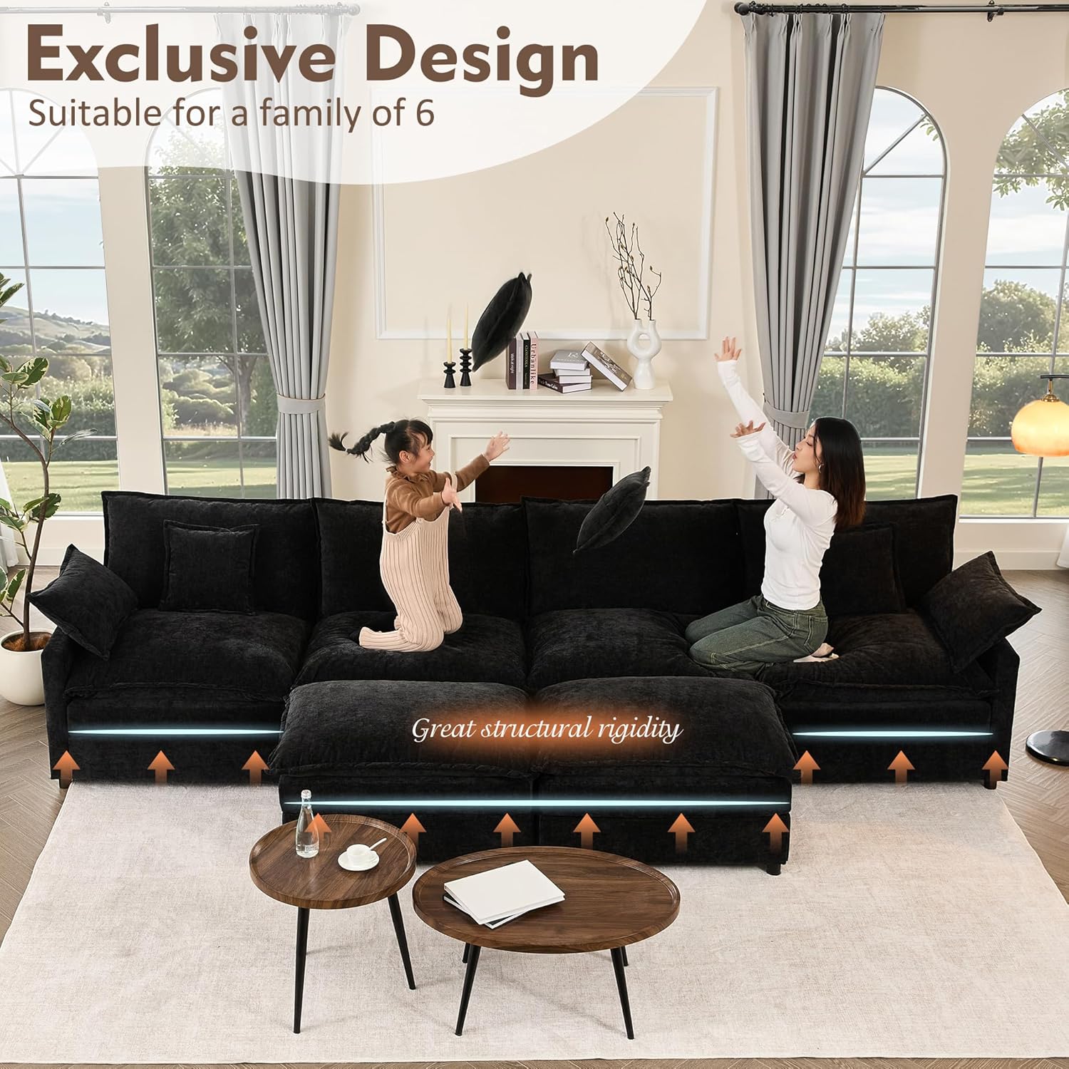 - Great Structural Rigidity: The sectional sofa features a sturdy steel frame and is equipped with high-quality double-layer foam cushions, offering superior comfort and support. It promotes healthy sitting posture, alleviates pressure on the lower back and muscles, and helps prevent discomfort and potential long-term health issues. With a length of 142.5 inches, this sofa is perfect for a family of 6