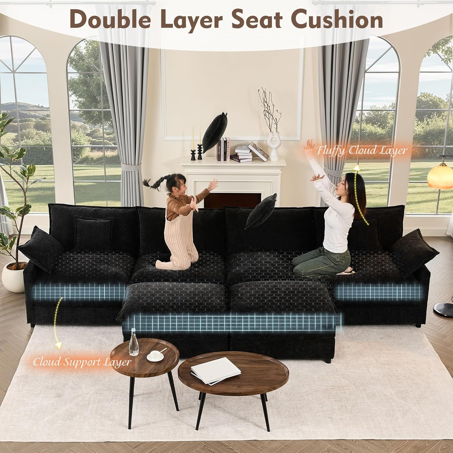 142.5" U Shaped Couch, Modular Sectional Sofa, 3-Seater Comfy Cloud Couch with Movable Ottoman, Deep Seat Couches for Living Room, Chenille, Black