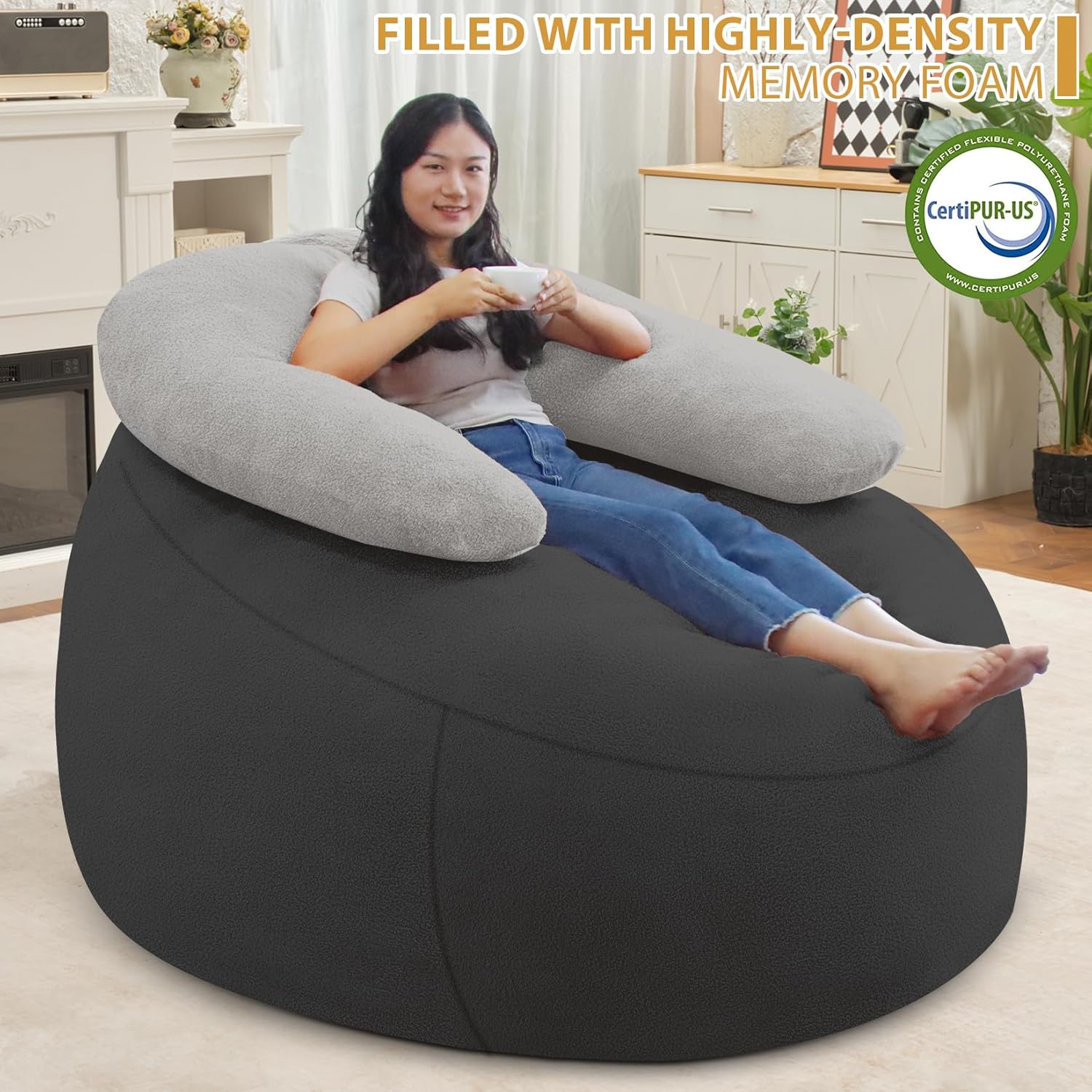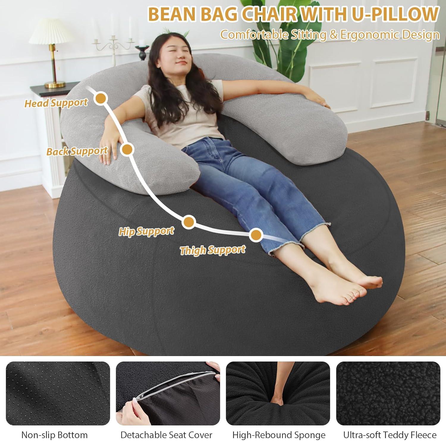HABUTWAY Bean Bag Chair with U-Shaped Pillow for Adult and Kids Big BeanBag Chair with Filling Ultra Soft Teddy Fleece Couch Chair with Washable Cover for Living Room Bedroom, Dark Grey & Light Grey