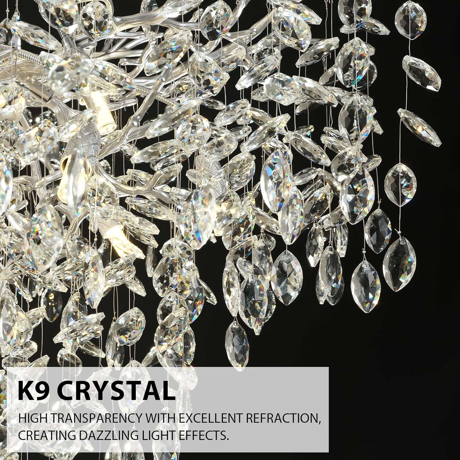 - Crystal + Metal: This nickel tree branch chandelier is crafted using 100% K9 crystal, providing enhanced transparency and refraction effects that exude elegance and sophistication. Made with high-quality metal, it is less prone to rust compared to other products, and its paint finish is resistant to peeling