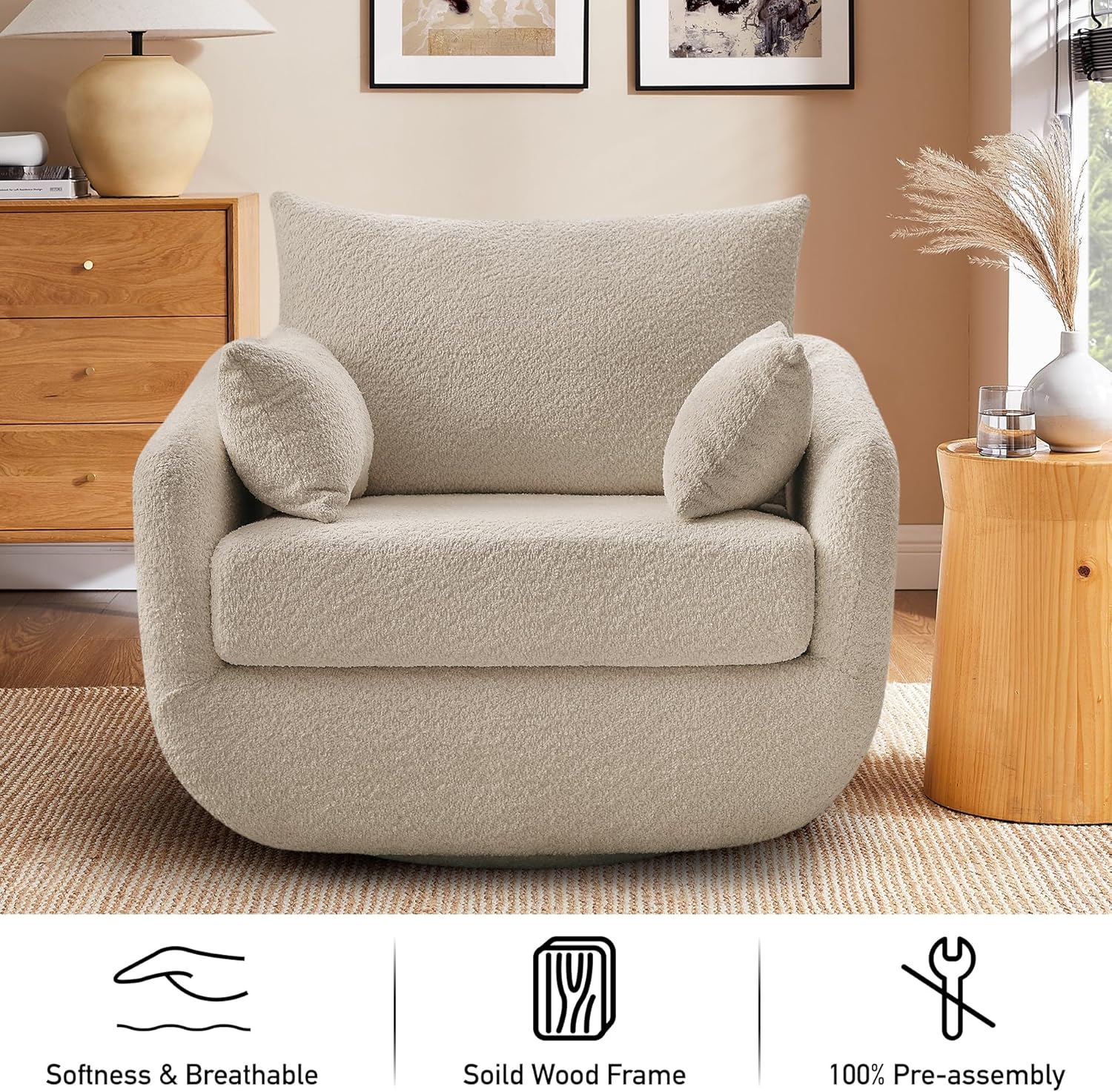 - Durable Construction & Floor-Friendly Design--- Built to last with a 360° solid wood swivel base (supports 330 lbs) and reinforced steel frame,No wobbling, squeaking, or sudden drops,just silent, stable rotation perfect for conversations,With its swivel base, the chair can rotate fully, maximizing space utilization in smaller rooms.The wood he base is wrapped with black anti-dirty gaske also protects hardwood floors from scratches.