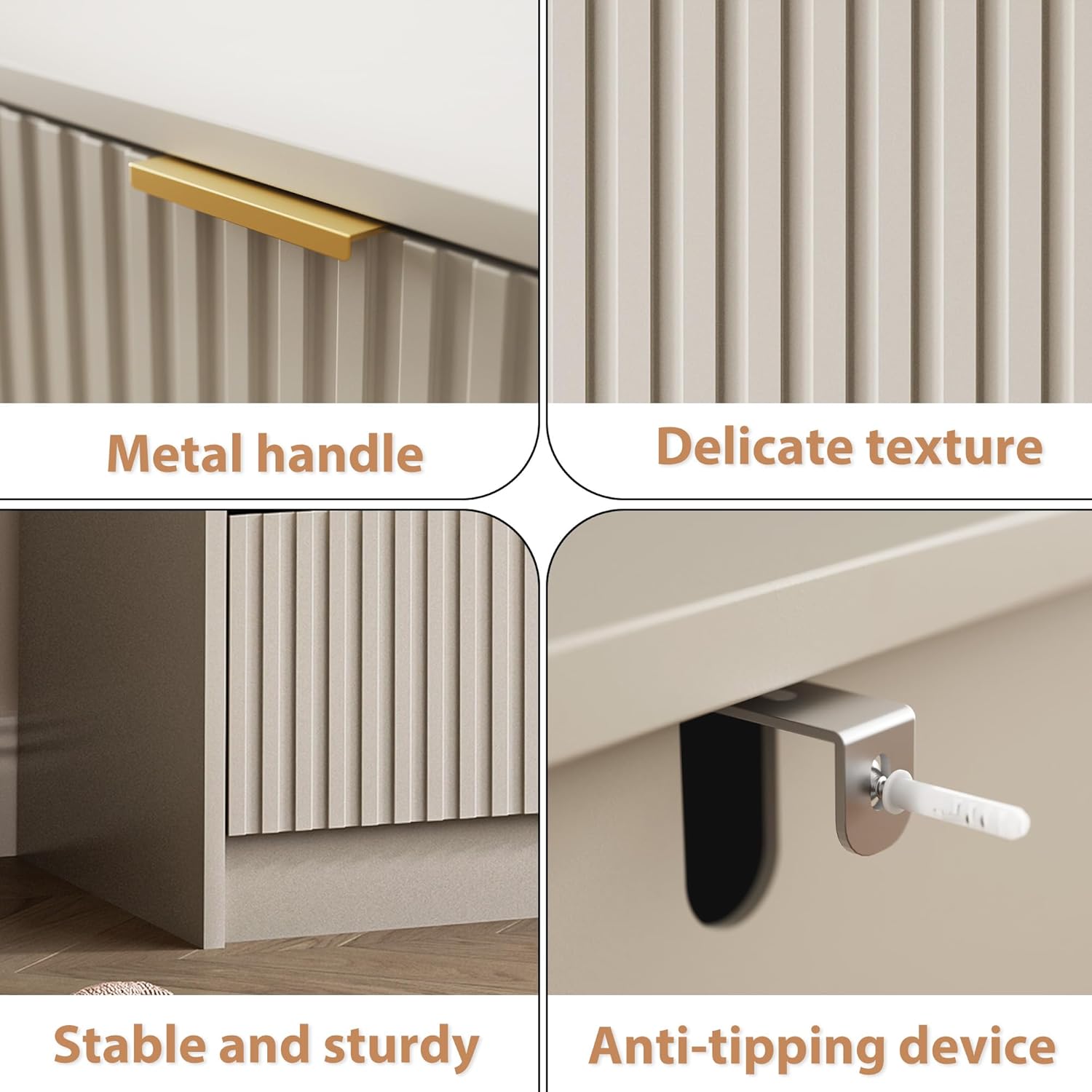 - Safety & Stability: Our fluted dresser features a dual anti-slip design, ensuring drawers stay securely in place, while anti-tipping straps provide added stability. The reinforced base and smooth damping system enhance structural integrity, offering reliable support for everyday storage needs.