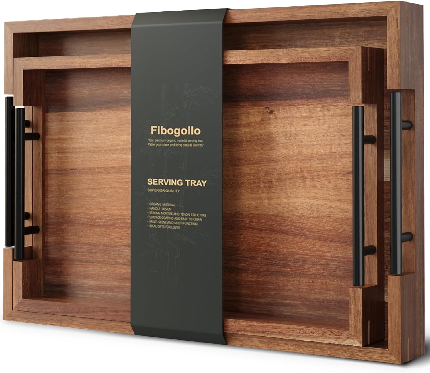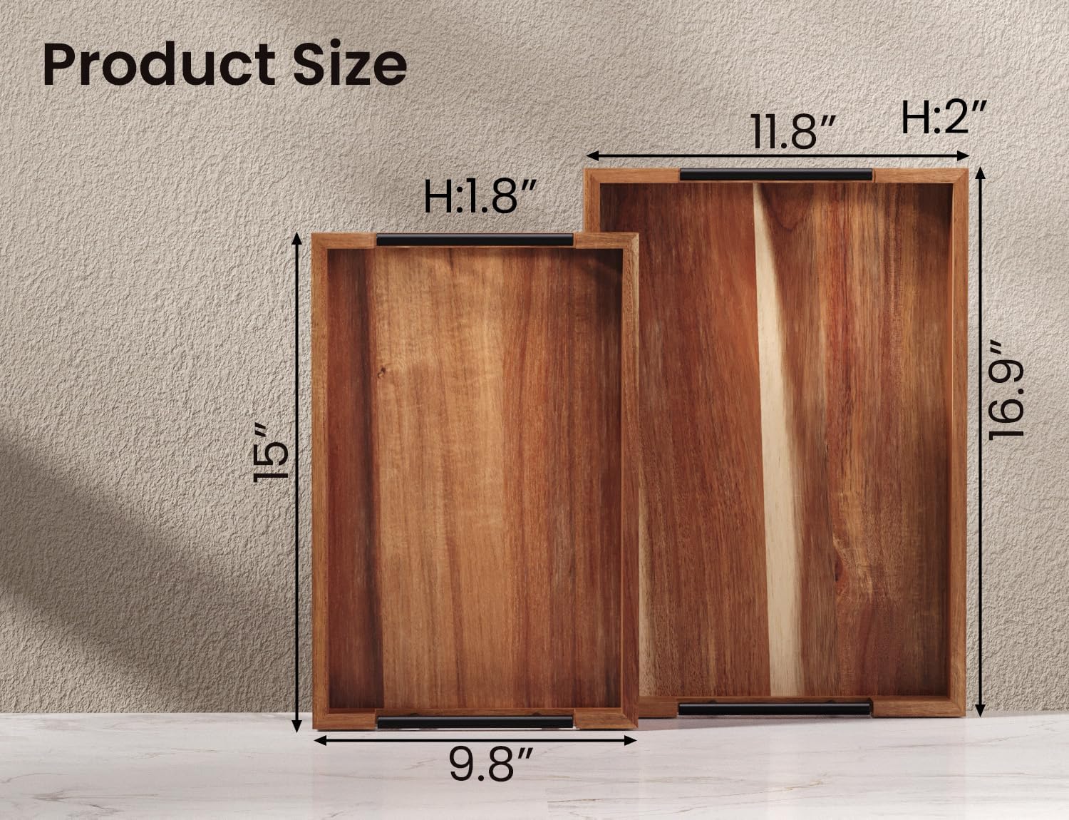 Acacia Wood Set of 2 Serving Tray with Metal Handles,Ottoman Decorative Trays Platter for Coffee Table,Living Room,Bar,Party