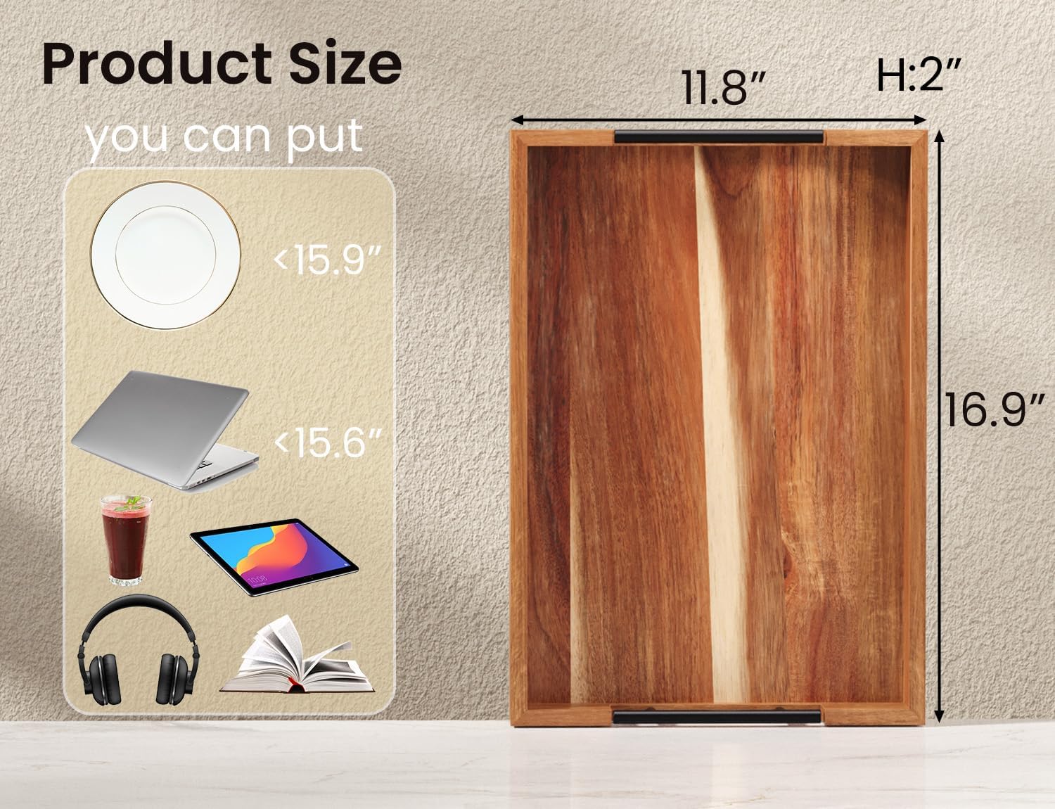 - 【Premium Material, beautiful and durable】 Crafted from carefully selected natural acacia wood, this piece retains the delicate tactile feel of the original wood grain. The surface is hand-polished and treated with eco-friendly lacquer, achieving a smooth and lustrous finish that is moisture-resistant and durable. The natural subtle fragrance and understated hues of the Acacia Woodimbue the tray with a rustic charm, allowing it to harmoniously integrate into any space while fostering a serene and soothing ambiance.