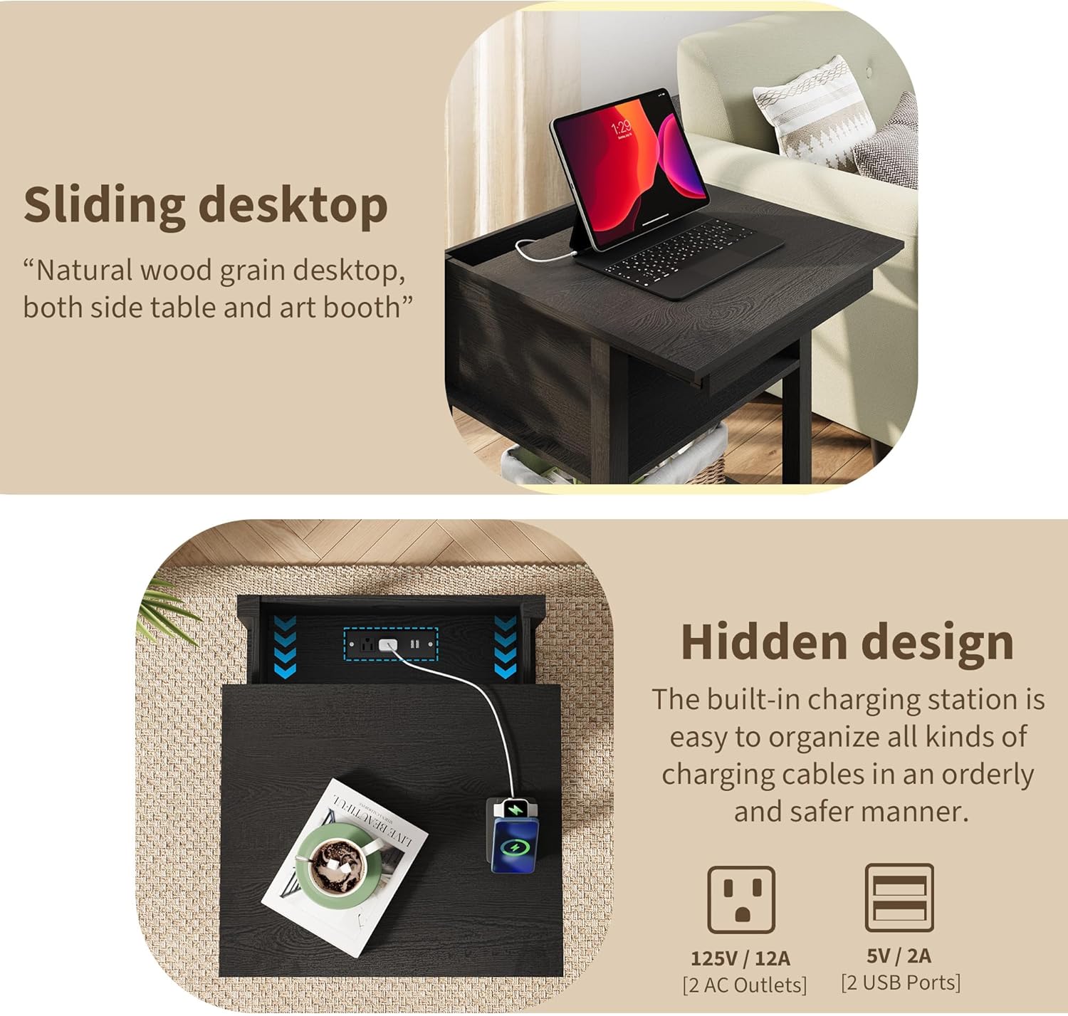 - 【 4 Ports Hidden Charging Station】Equipped with 2 AC outlets and 2 USB ports, plus a 6.23ft power cord for flexible placement. Keep your phone, tablet, or lamp powered without messy cables—perfect as a bedside table or end tables living room.