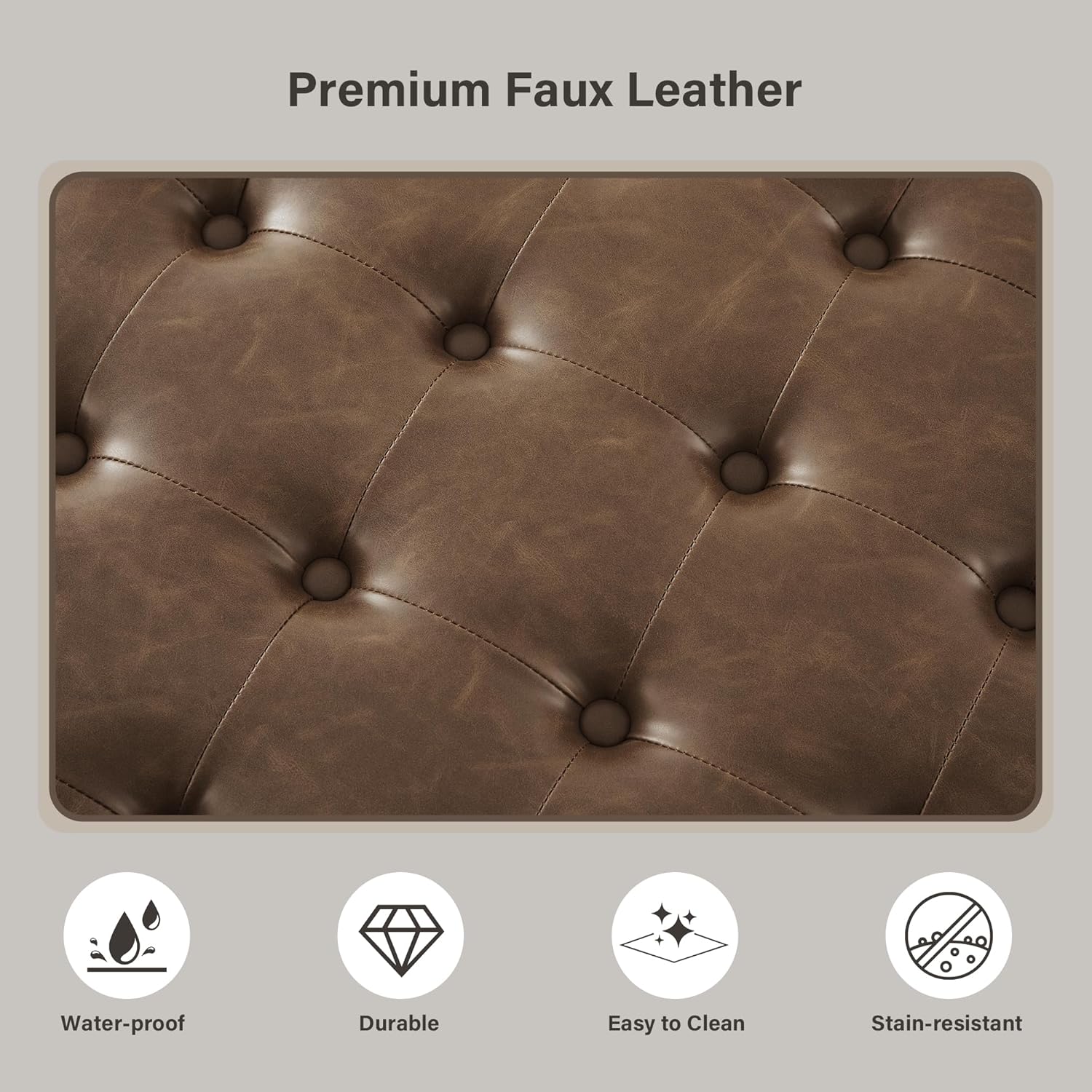 - Premium Faux Leather: 30-inch round ottoman is made with high-quality PU leather that is soft, durable, and easy to clean. The rich brown of upholstered storage ottoman finish resists stains and wear, maintaining a sleek look over time