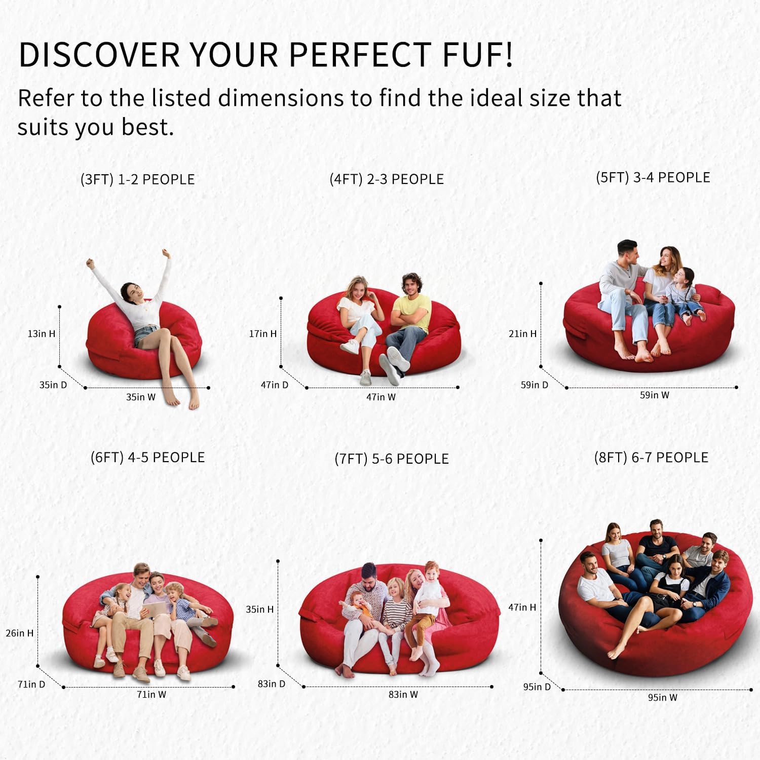 - 【Choose The Perfect Size for Your Space】 Our Bean Bag Sofa Covers Are Available In Six Sizes, From 3ft To 8ft, Catering To Both Kids And Adults.The 3ft (Capacity: 1-2 People),4ft (Capacity: 2-3 People),5ft (Capacity: 3-4 People),6ft (Capacity: 4-5 People),7ft (Capacity:5-6 People),And 8ft (Capacity:6-64 People) Options Ensure You Find The Ideal Fit.Each Size Adds A Stylish Touch To Any Space,Making Them A Versatile Addition To Your Home.