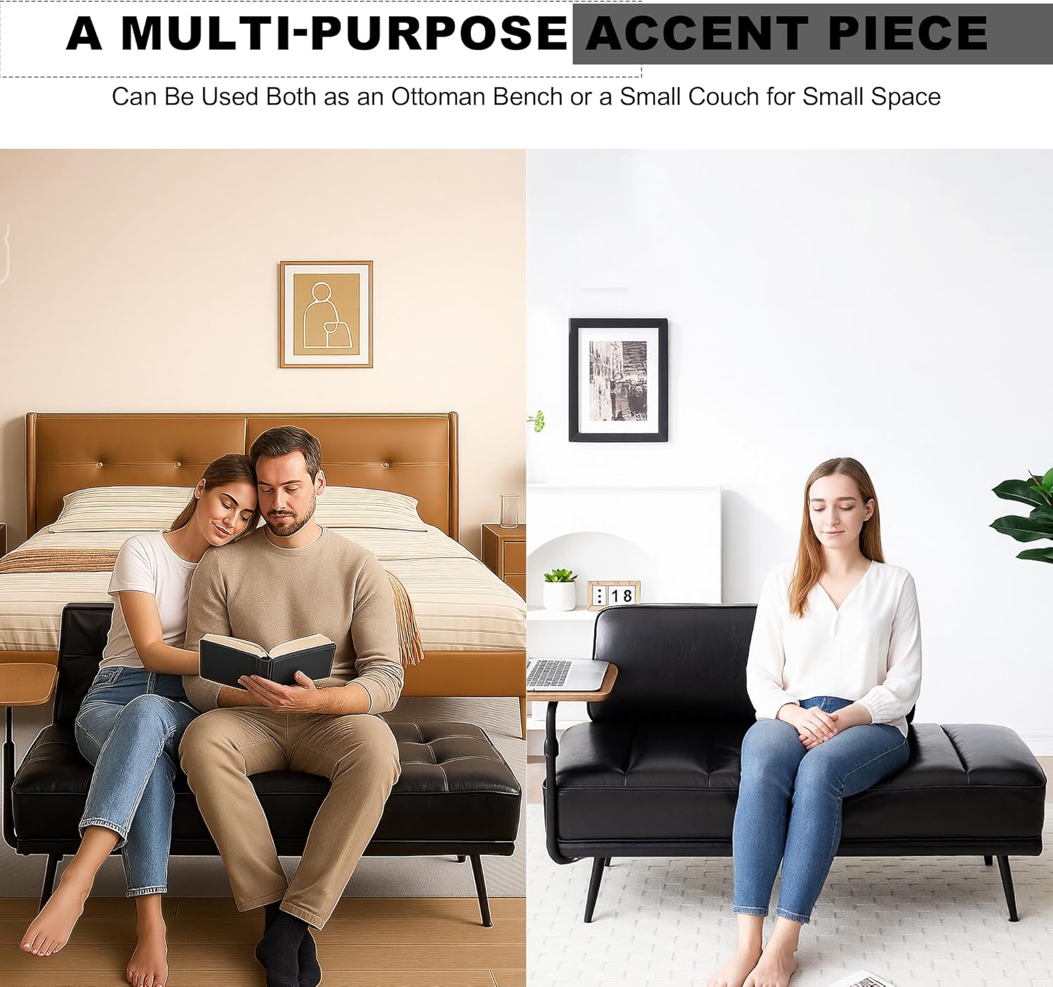 Sofa,Bed Bench,Small Spaces Furniture,Polyurethane Leather,Wood Frame,High Density Sponge Infillings,360-Degree Swivel Tray,Black Metal Leg (Black)