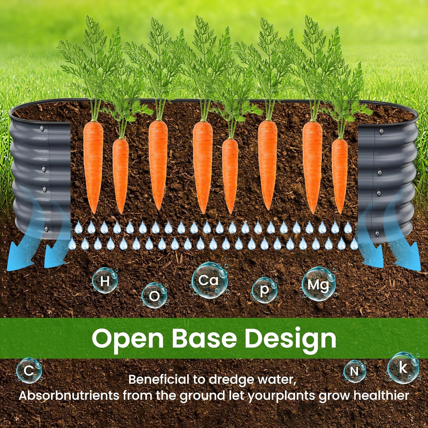 - Open Base Design:This metal raised garden bed is designed with an open base, makes this the perfect space to layer yard waste,grass clippings, fruits/veggies, or coffee grounds, to create enriched soil in your own backyard,It allow the roots absorb better nutrients, providing good drainage, and protect your plants.