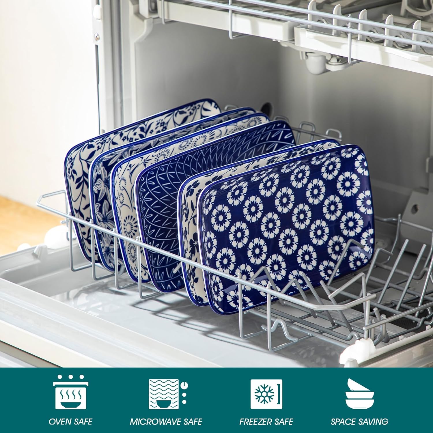 vancasso Selene 9.5 Inch Rectangular Dinner Plates Set of 6, Ceramic Salad Plates for Dessert, Appetizer, Porcelain Serving Platters for Entertaining, Microwave & Oven Safe, Vintage Blue & White Color