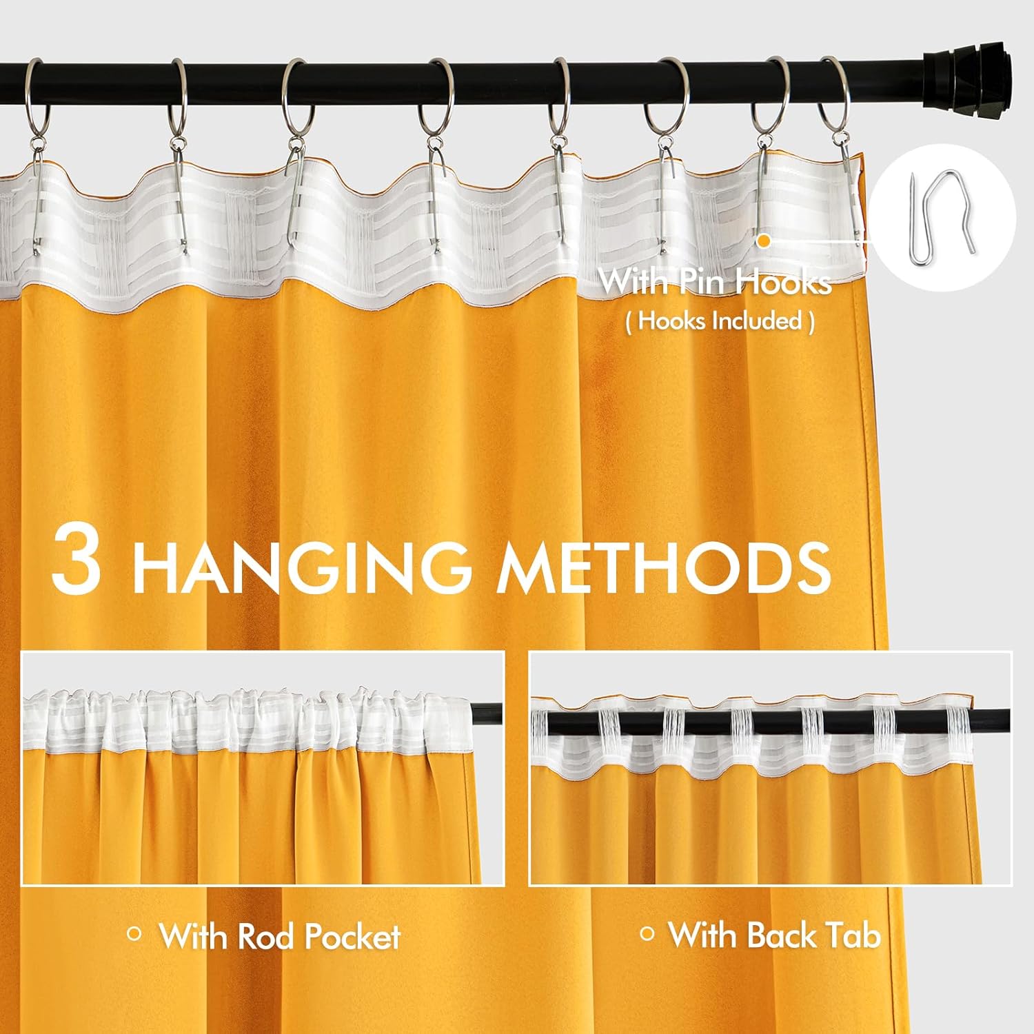 - MULTIPLE HANGING OPTIONS: Each curtain panel features a 3-in-1 top style design: Rod Pocket, Back Tab and Pinch Pleat. The Back loop (2.3 "long) and rod pocket (3.1" long) fit most standard rods. Curtains also can be hung with clip rings or different type of hooks. We will give away 20 pin hooks for each pair of curtains for your convenience (rings won't be included). 3 ways to meet your various needs.