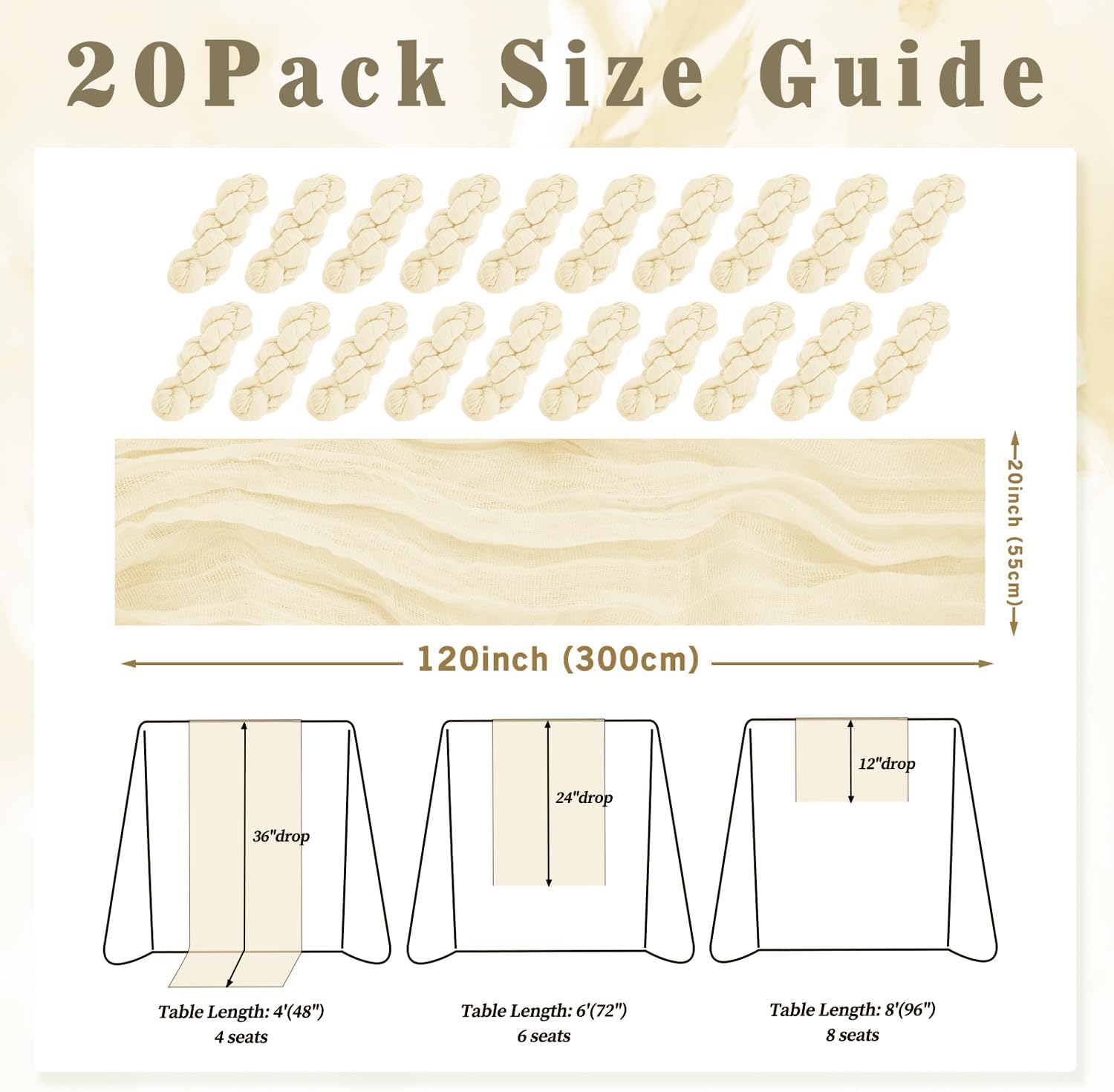- Cheesecloth Table Runner Size: You will receive 20 beige cheesecloth tablerunner, each measuring 20 x 120 inches. The quantity is sufficient for you to decorate various romantic occasions. It can decorate most shaped tables, such as rectangular tables, round tables, and cocktail tables. It is long enough to decorate a large table and be placed perfectly and elegantly on the tabletop, adding a romantic atmosphere to your occasion.