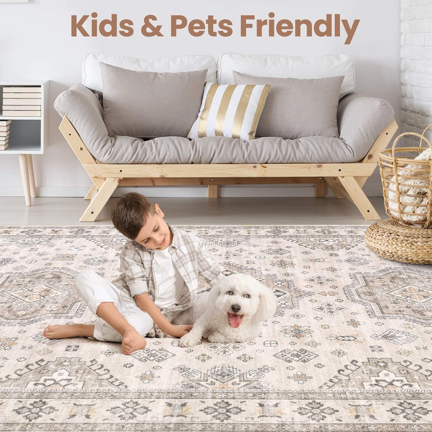 Washable Area Rugs for Living Room -10x13 Neutral Vintage Distressed Floral Farmhouse Boho Large Soft Floor Rug Indoor Non Slip Carpet for Living Room Bedroom Dining Room Office-Beige Brown