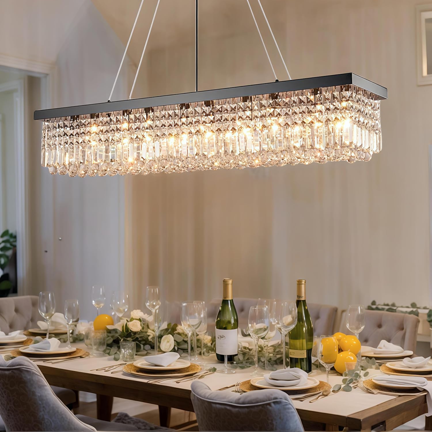 - IDEAL SIZE & ADJUSTABLE HEIGHT: This K9 chandelier measures L47" x W10" x H10", a perfect size to illuminate dining tables or kitchen islands without overwhelming the space. The hanging wires are adjustable up to 59", allowing you to set the perfect height on flat or sloped ceilings for a tailored fit in dining rooms, kitchens, living rooms, and more.