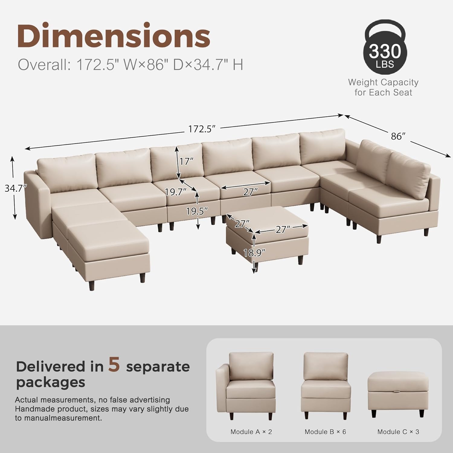 Oversized 172.5" Faux Leather Modular Sectional Sofa, Modern Large 11 Seater U Shaped Couch with Storage Seat with Reversible Chaise Deep Seat for Living Room DIY Combination - Whitesand