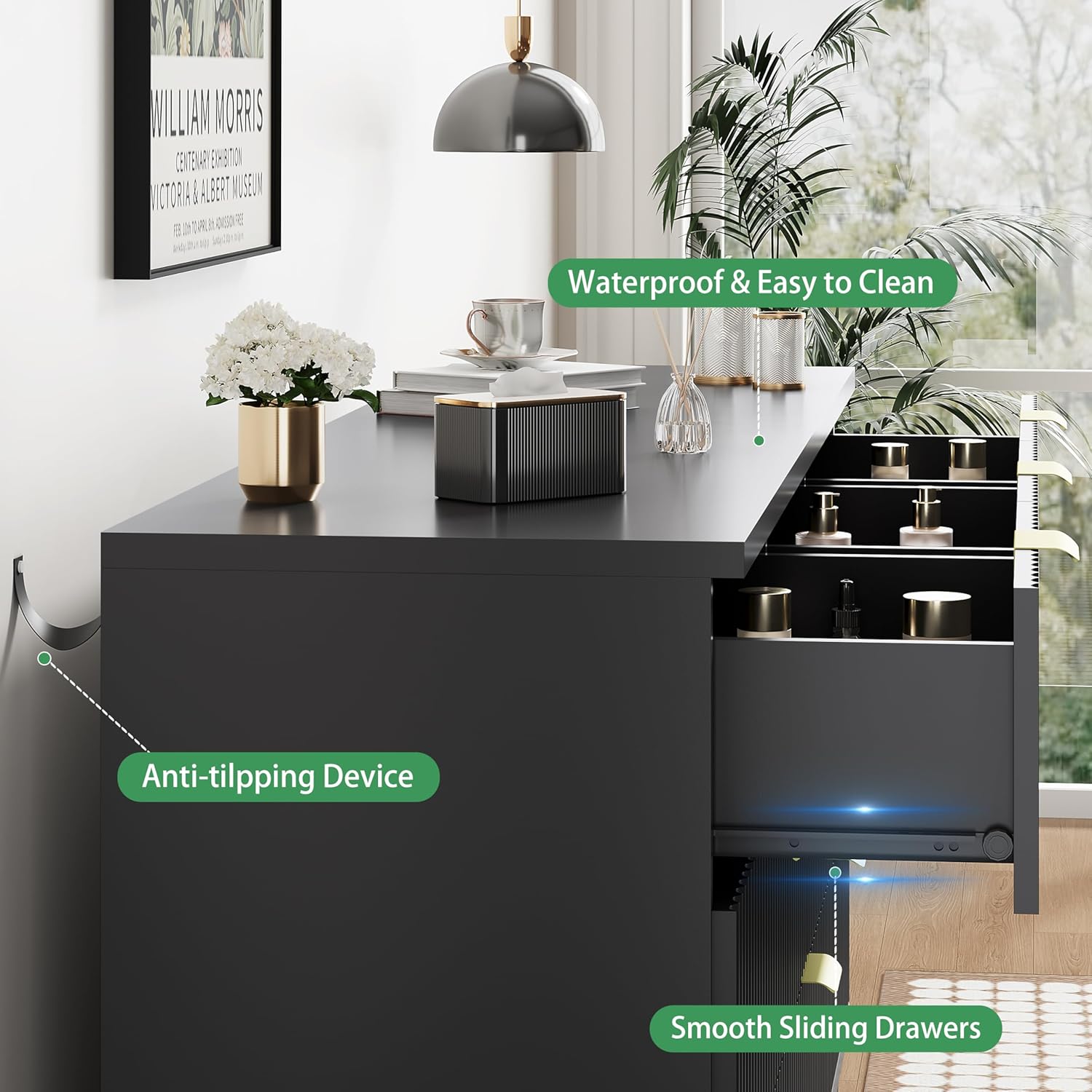 - ăStability & SafetyăThe white/black/natural oak dresser is equipped with an anti-tipping device, which can be fixed on the wall to prevent accidents. Each drawer contains a wide metal handle and built-in slide rail, easy to push and pull. Besides, the sturdy base provides this dresser with drawers a strong support and the middle feet can be adjustable to keep balance on uneven floors