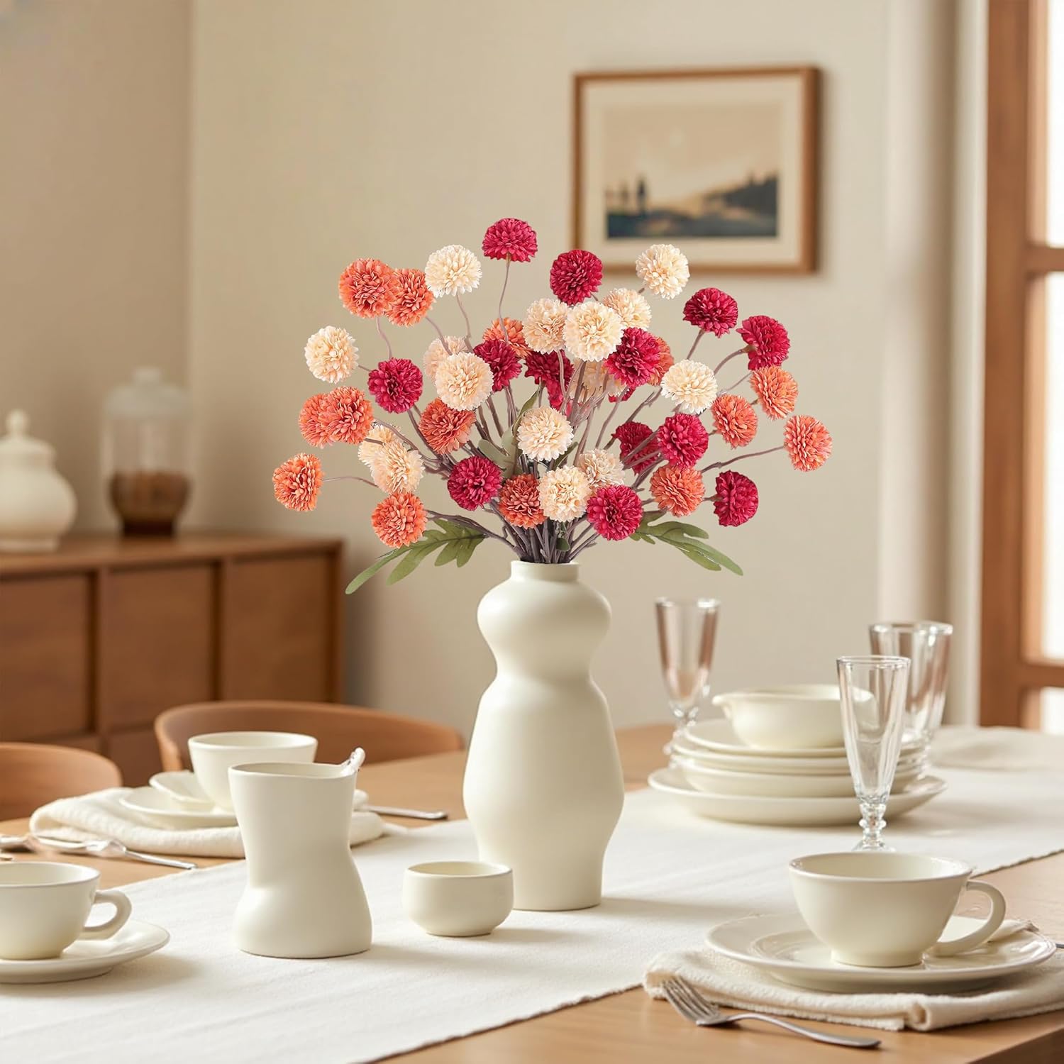 - QUALITY MATERIAL: These faux silk pompon m um artificial flowers are made of high quality simulated silk. The stems are made of wire and can be bent at will, very flexible, also can be cut to any length to match your vase