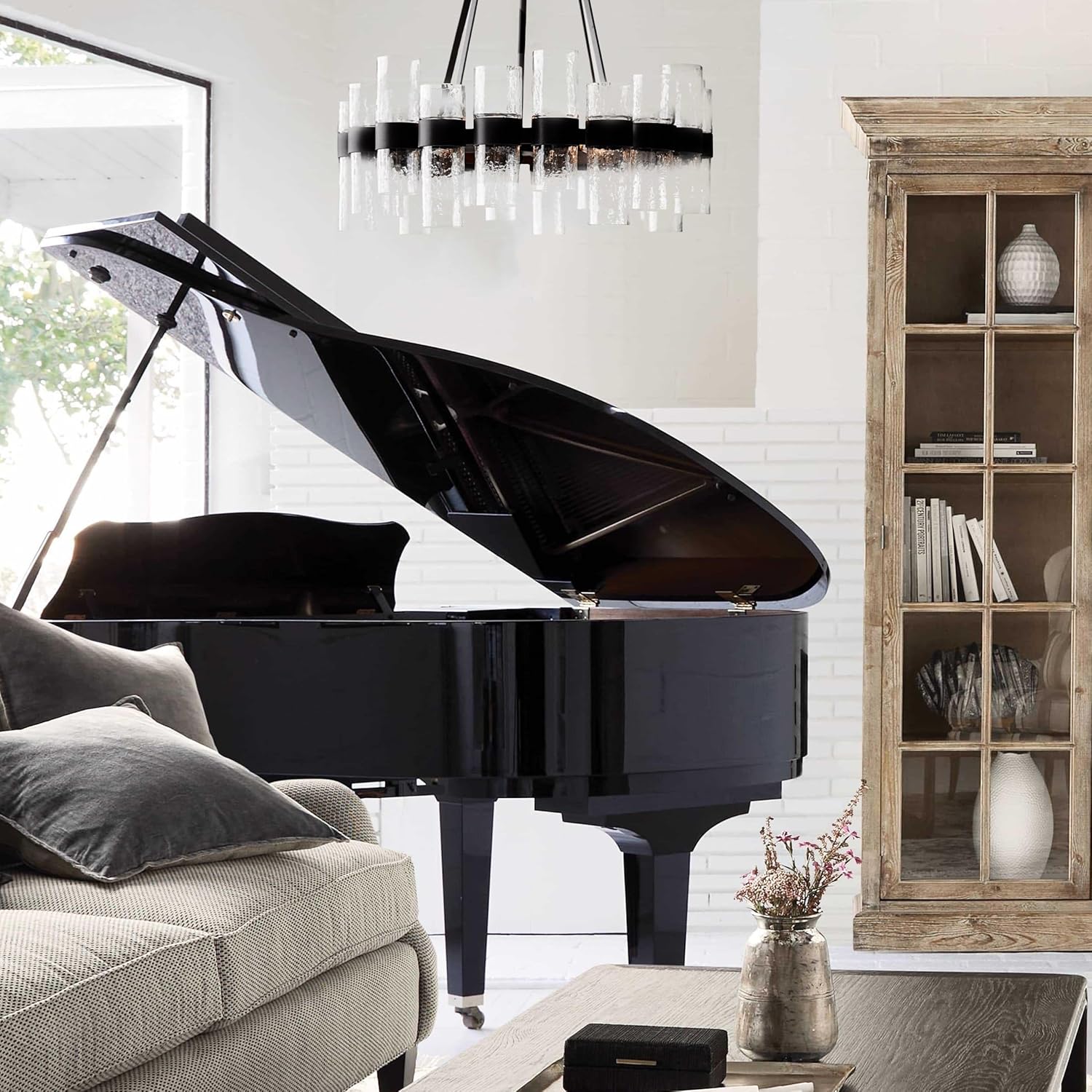 Round Black Glass Wagon Wheel Chandelier, Chandelier with Water Ripple Textured Recycled Clear Glass Piece, Modern Industrial Pendant Light with Metal Frame, Lighting Fixture for Living Room, Foyer